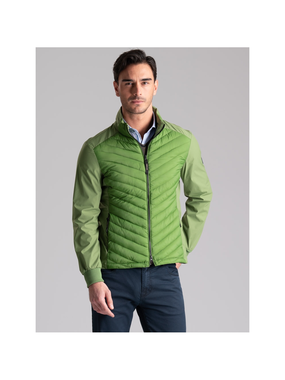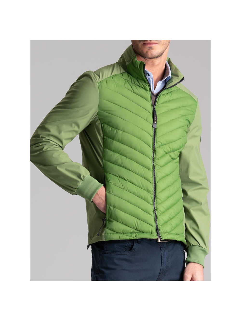 Giubbino uomo con cappuccio, caratterizzato da una linea sportiva con tessuto imbottito davanti e tessuto tecnico sul retro e le maniche.