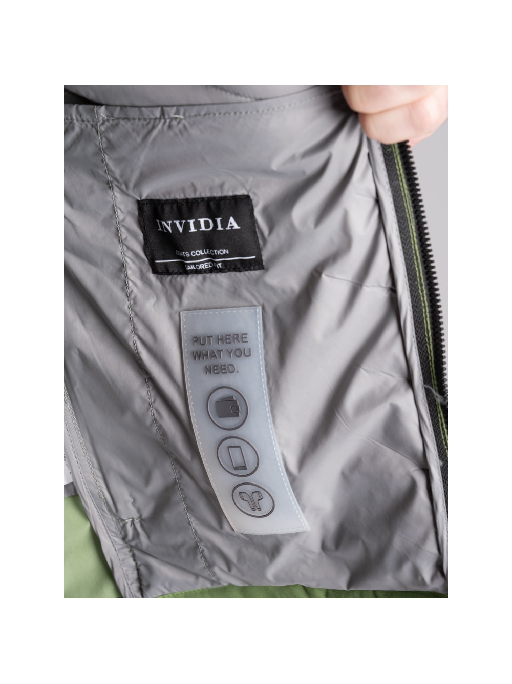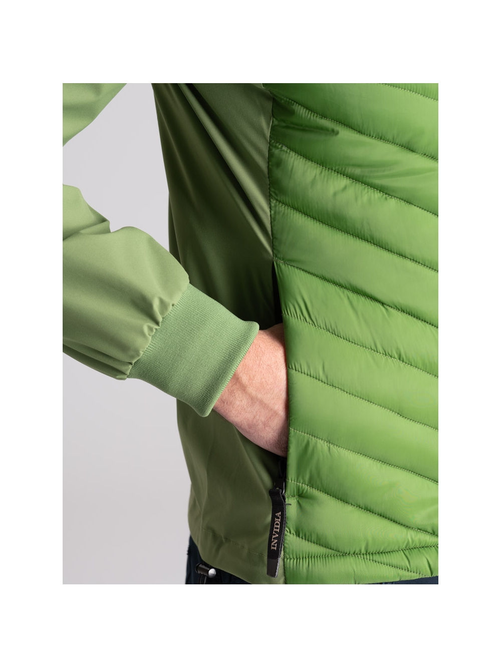 Giubbino uomo sportivo realizzato con un tessuto di nylon stretch a spina di pesce imbottito in eco piuma Poli Down sul davanti, e tessuto tecnico liscio sulle maniche e la schiena. Realizzato in due varianti colore, blu e verde brillante, il giubbino è caratterizzato da una zip nera a contrasto per le tasche e la chiusura con cursore in gros grain gommato logato INVIDIA 1973, presenta un cappuccio di servizio a contrasto colore grigio nascosto nel collo con zip invisibile e una coulisse elastica sul fondo per regolare la vestibilità del capo. All’interno ci sono diverse tasche di servizio tutte perfettamente rifinite con cerniere, una lunetta con logo INVIDIA 1973 e il sacchettino porta etichetta. A completamento, le etichette in silicone che raccontano in modo originale e giocoso le qualità di questo giubbino uomo sportivo (waterproof, wind stop, breathable, crease resistant) e le istruzioni di lavaggio.