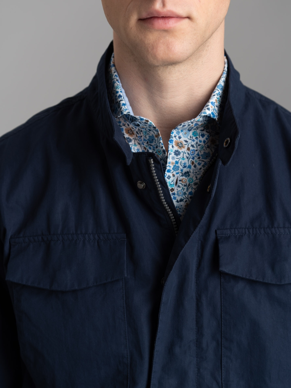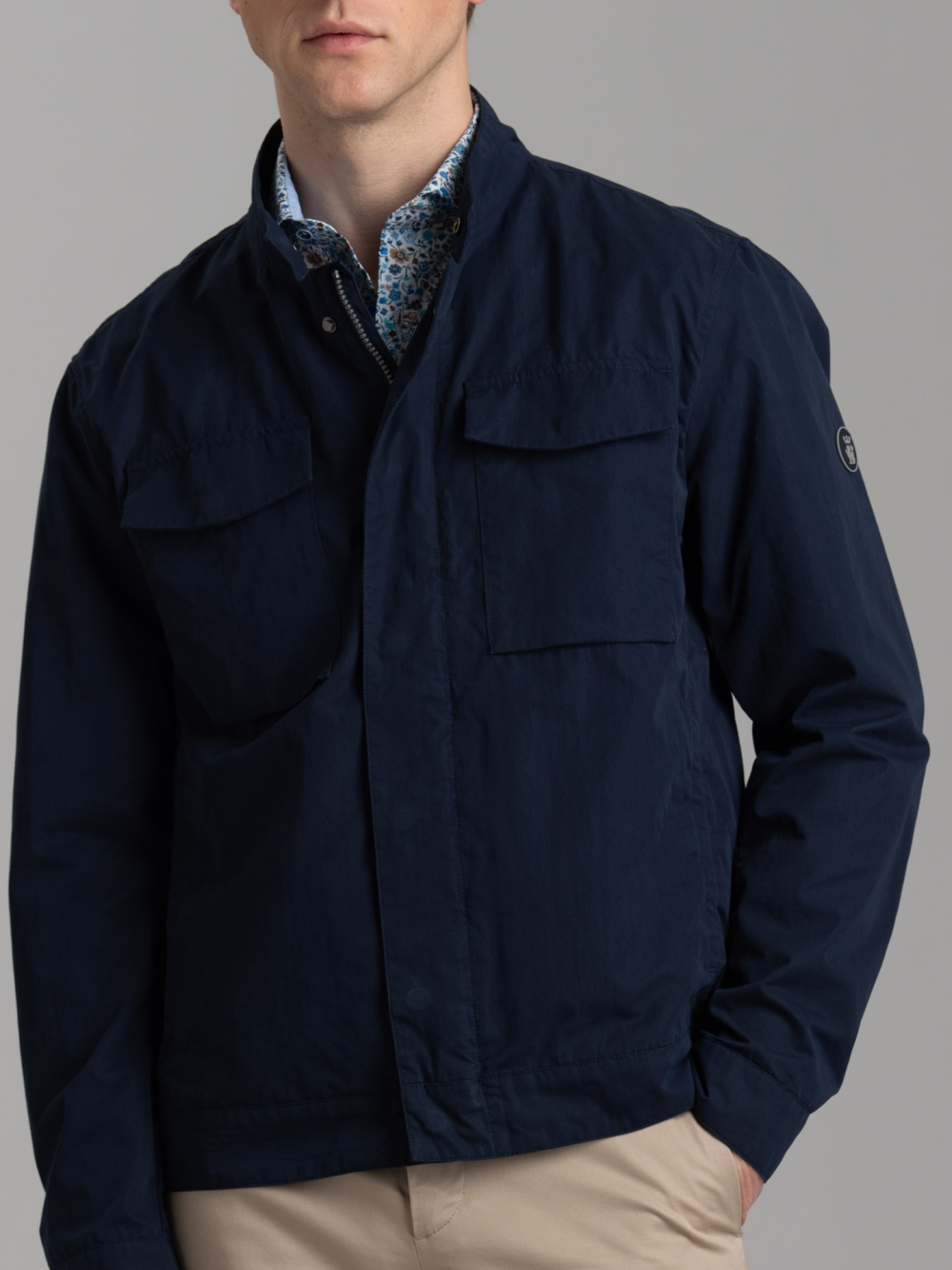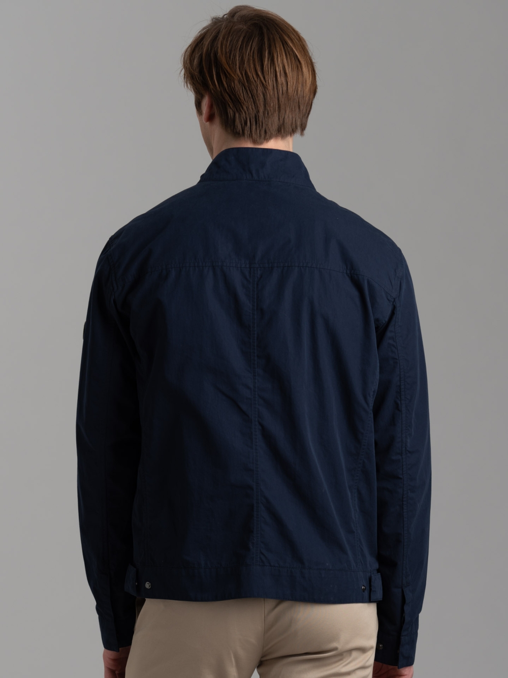 Giubbino uomo realizzato in cotone nylon lavato con effetto mano pesca, ideale per un look casual e pratico. Presenta tasche applicate in alto con soffietto, tasche laterali con bottoni nascosti e una chiusura con doppia zip e bottoni. L’interno è sfoderato e bordato, con porta etichetta e stampa TECNO sulla tasca applicata interna con la descrizione delle caratteristiche del capo (waterproof, wind stop, breathable, crease resistant). Disponibile in due varianti colore: blu e militare.