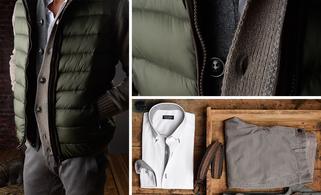 Un’idea potrebbe essere quella di abbinare il giubbotto senza maniche ad un cardigan a lupetto e ad un chinos tasca america in gabardina (un tessuto di lana o di cotone, con trama diagonale, di media pesantezza e facilmente impermeabilizzabile).