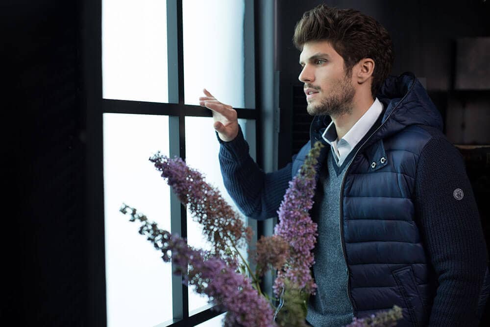 • l’intramontabile bomber con il cappuccio trapuntato da indossare con abiti formali ton sur ton, ma anche in un contesto relax, abbinato a denim e maglione