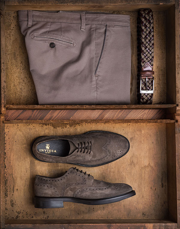 Per un outfit uomo elegante, una sneaker sobria, un mocassino, una polacchino uomo o al massimo una stringata andranno benissimo, purché siano sempre in accordo con la lunghezza del pantalone (per evitare il look pagliaccio).