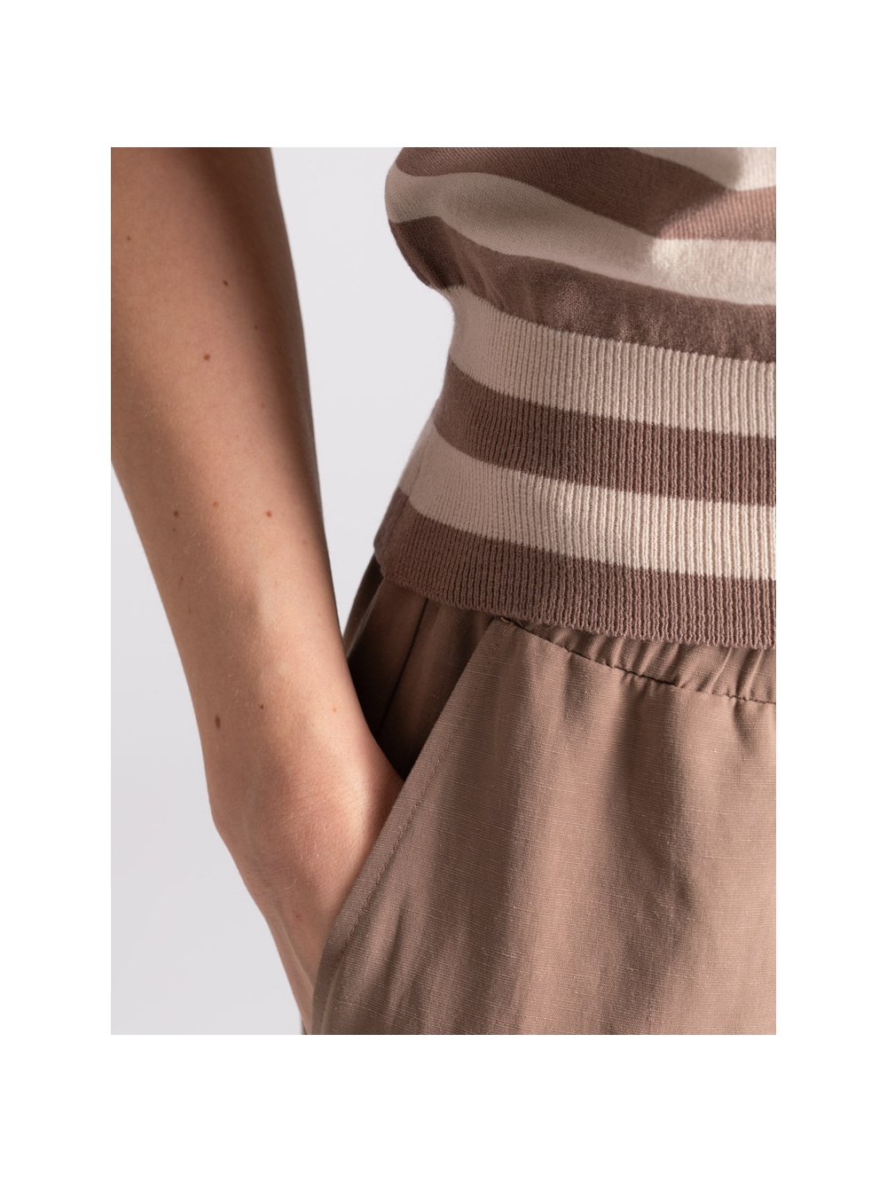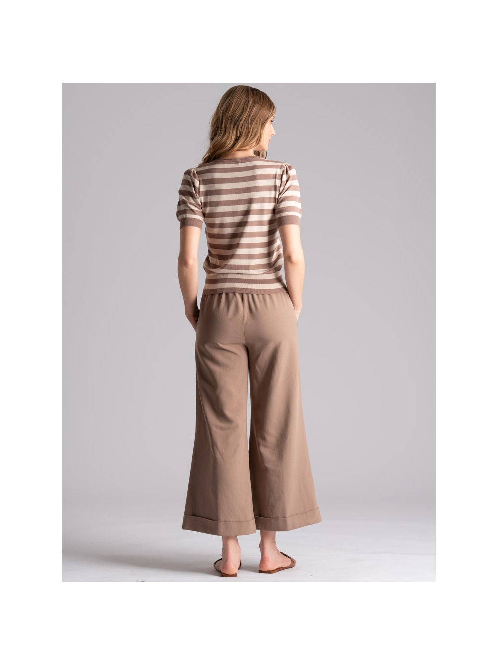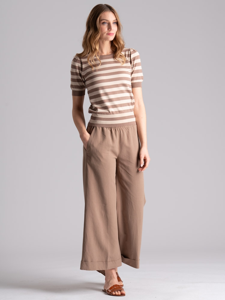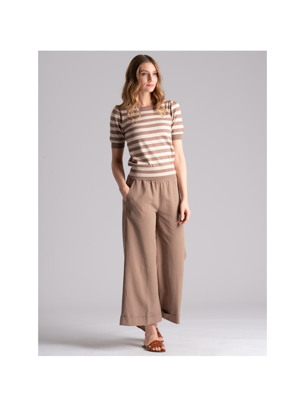 Maglia donna girocollo in morbida di viscosa tinto filo con fantasia a righe, caratterizzato dalla mezza manica a sbuffo e balza sul fondo con rib rigato. Questa maglia girocollo è disponibile nelle varianti colore azzurro-sabbia e terra-sabbia.