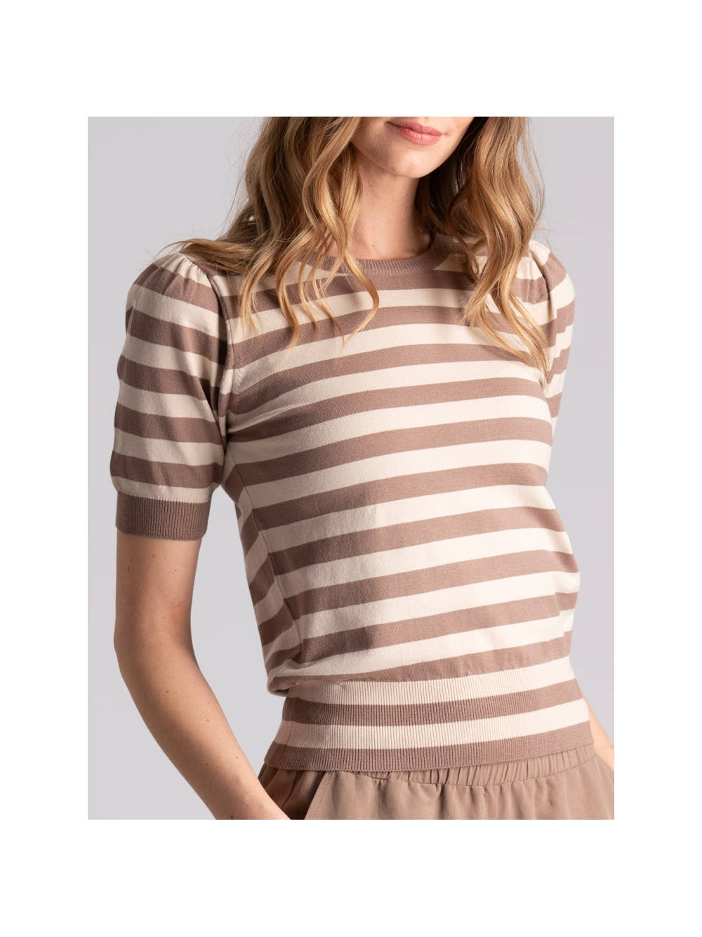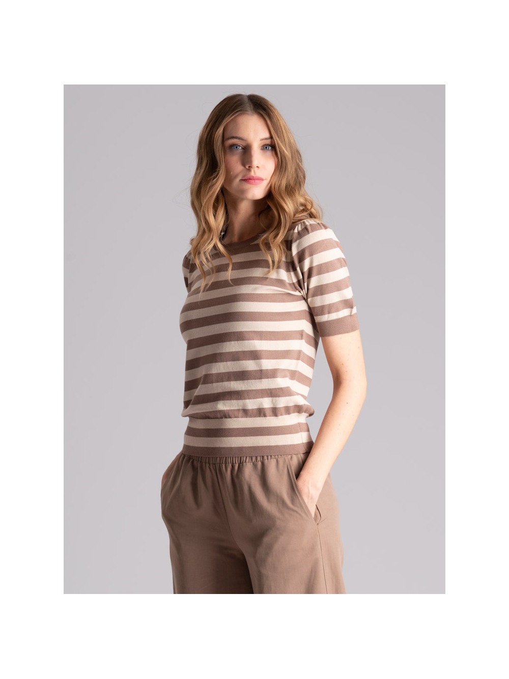 Maglia donna girocollo a righe con mezza manica a sbuffo, realizzata in morbida maglia di viscosa.