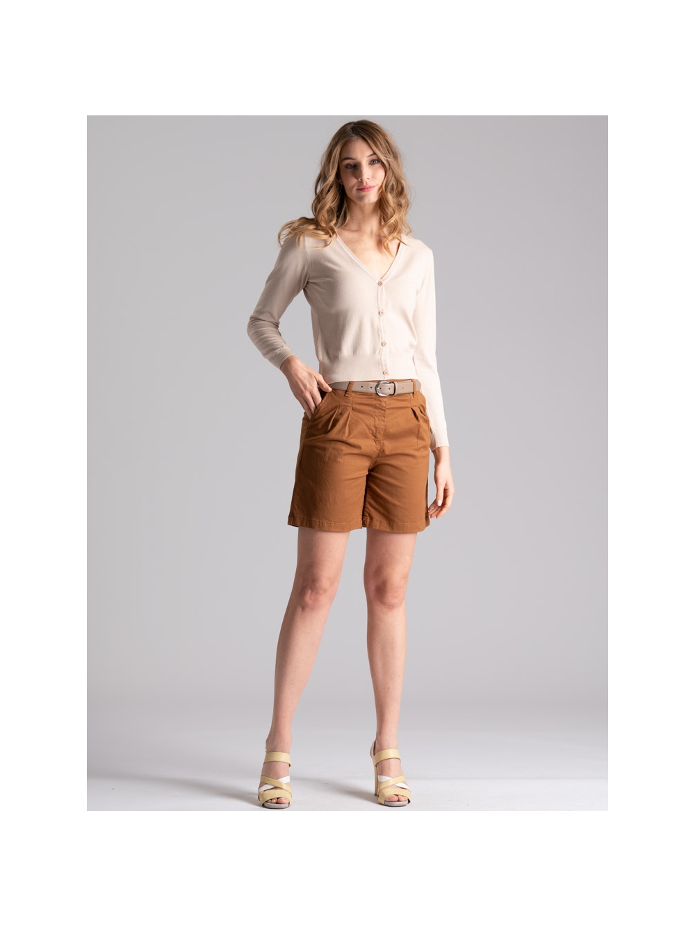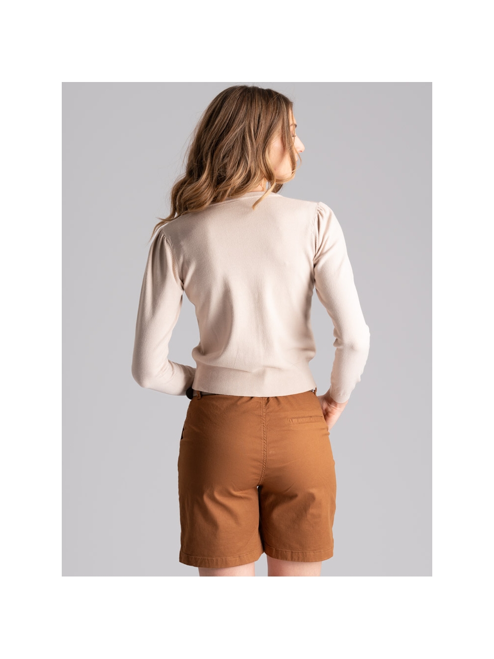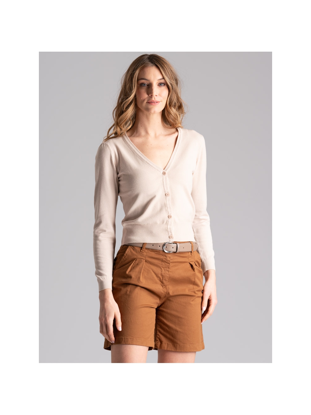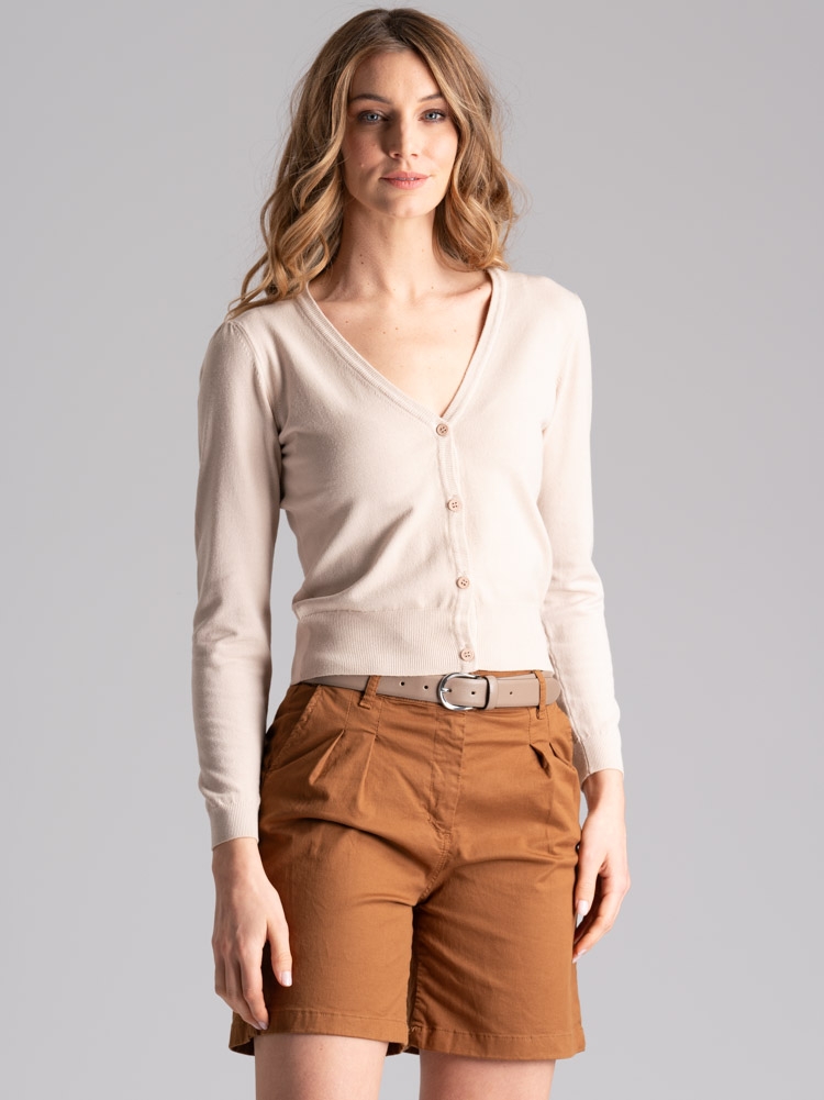 Cardigan donna realizzato in morbida maglia di viscosa tinto capo, caratterizzato da uno scollo a V, chiusura con quattro bottoni e manica a sbuffo. Questo cardigan è disponibile nelle varianti colore sabbia e azzurro.
