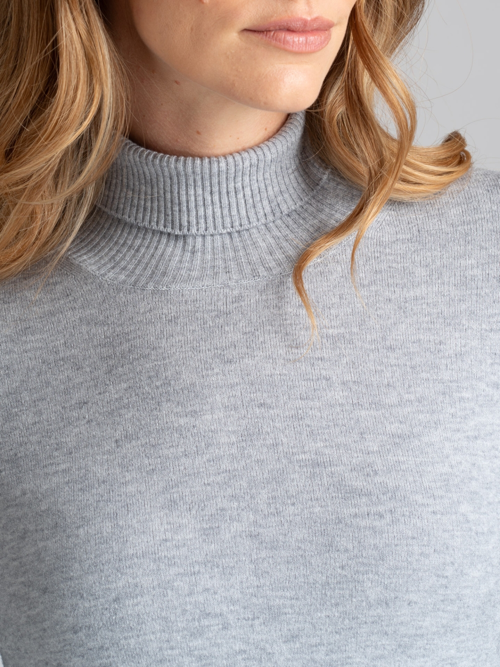 Maglia donna modello dolcevita basic. La maglia è in tessuto misto viscosa finezza 12 ed è disponibile nelle varianti colore panna, grigio perla e nero.