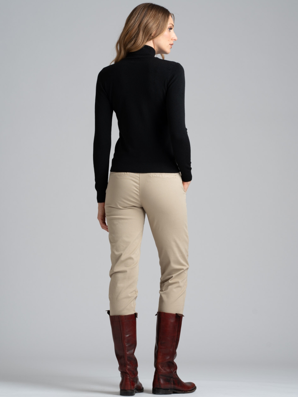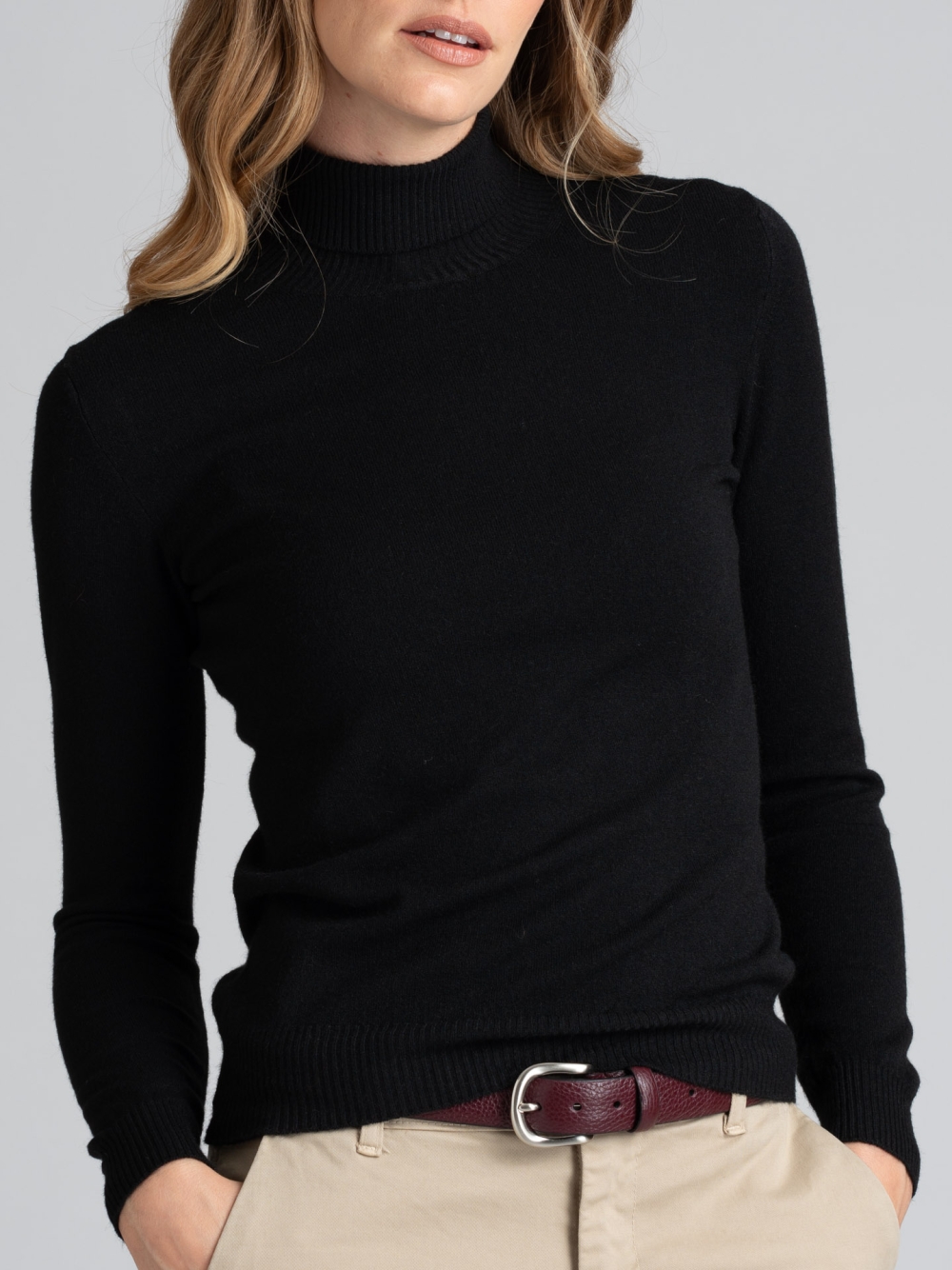 Maglia donna modello dolcevita basic. La maglia è in tessuto misto viscosa finezza 12 ed è disponibile nelle varianti colore panna, grigio perla e nero.