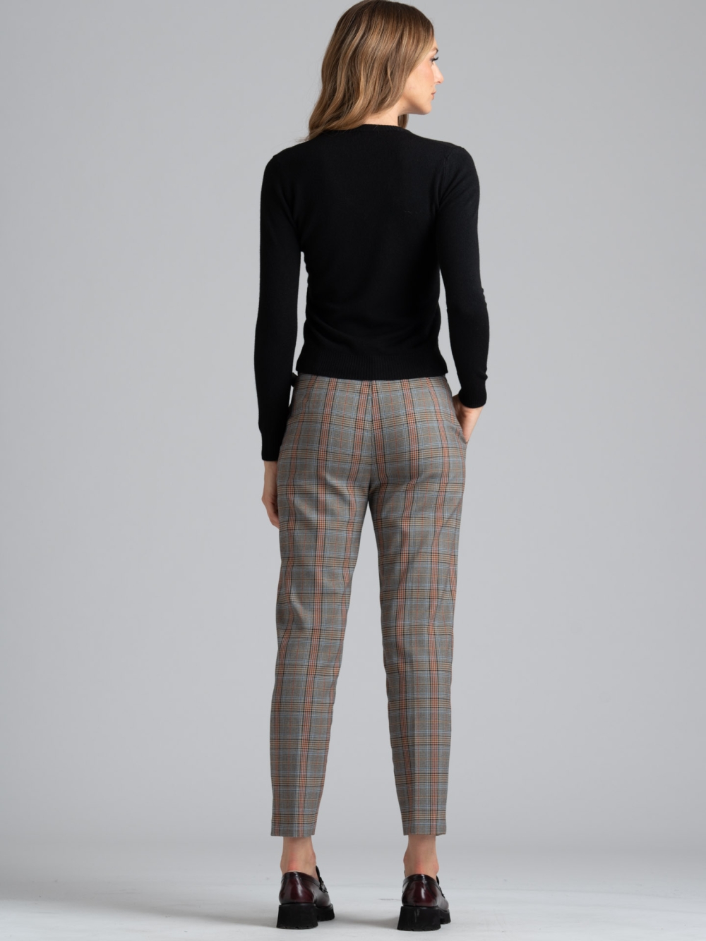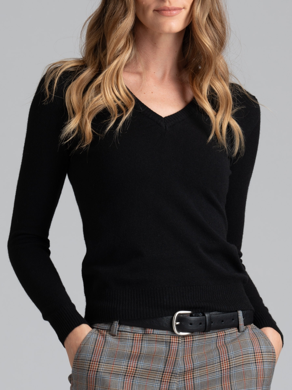 Maglia donna modello scollo a V. La maglia è in tessuto misto viscosa finezza 12 ed è disponibile nelle varianti colore panna, cammello e nero.