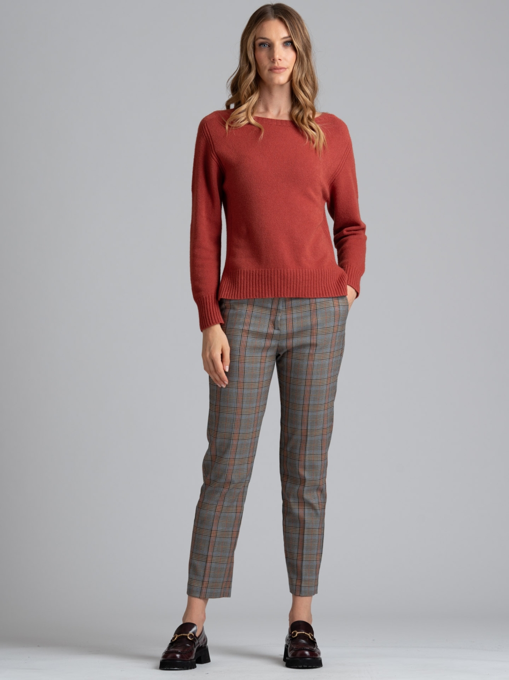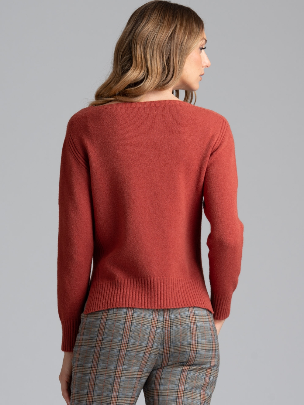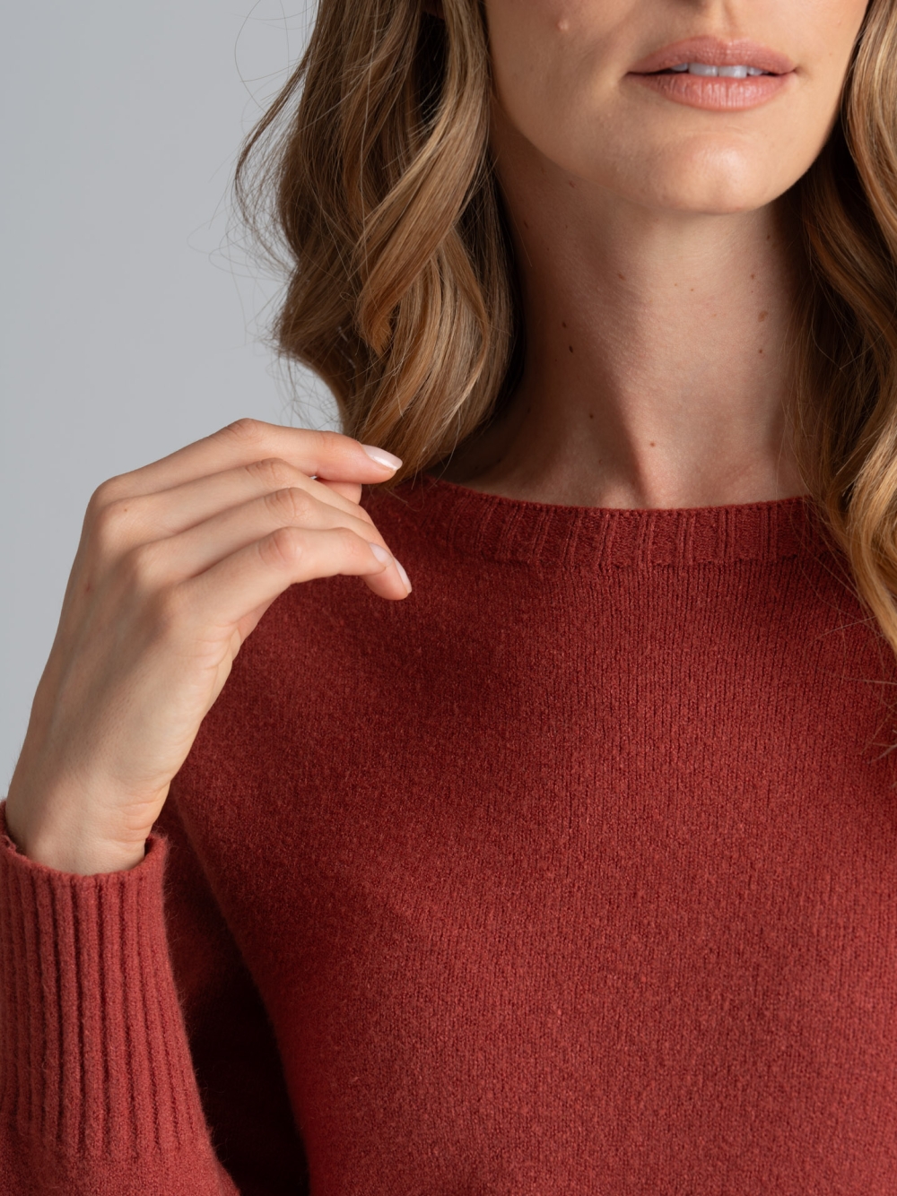Maglia donna modello girocollo aperto. La maglia è caratterizzata da una finezza 7, dalla lavorazione a coste lungo i fianchi e dallo spacco. È disponibile nelle varianti colore ottanio, terracotta e beige.