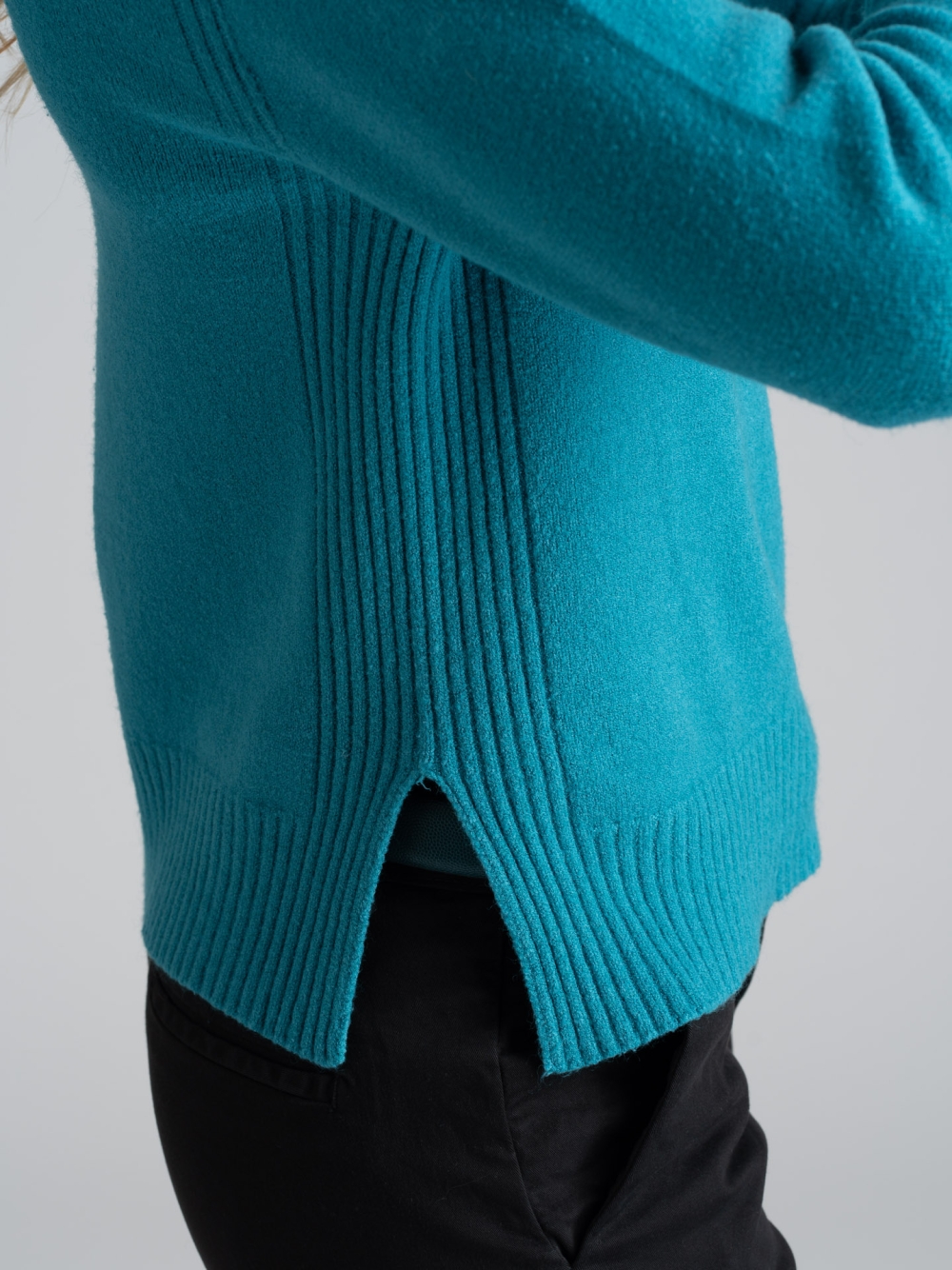 Maglia donna girocollo aperto finezza 7 con lavorazione a coste lungo i fianchi e spacco.