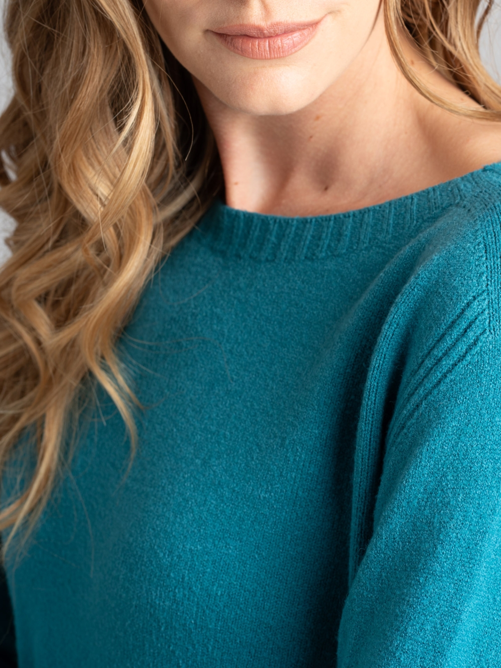 Maglia donna modello girocollo aperto. La maglia è caratterizzata da una finezza 7, dalla lavorazione a coste lungo i fianchi e dallo spacco. È disponibile nelle varianti colore ottanio, terracotta e beige.