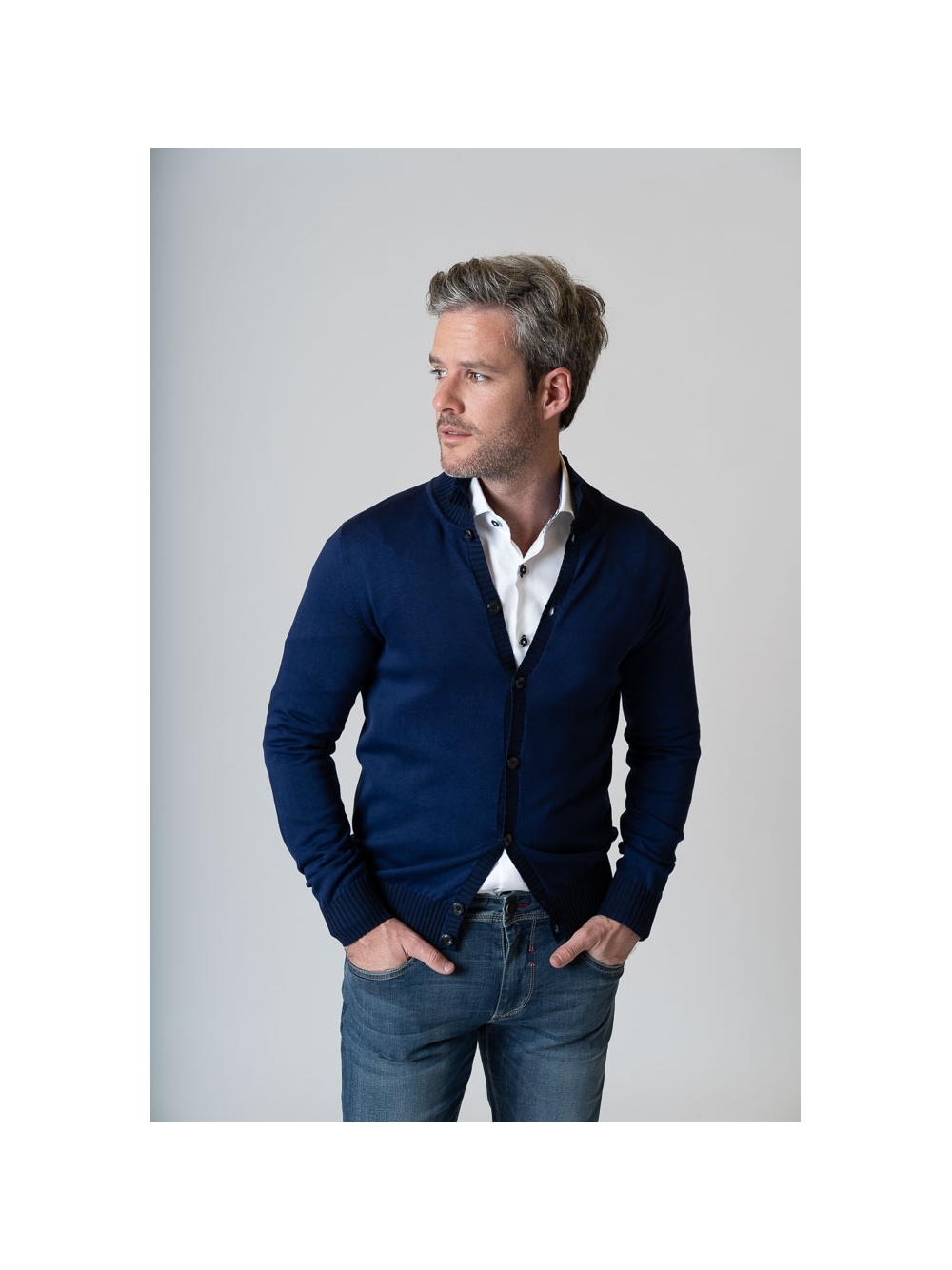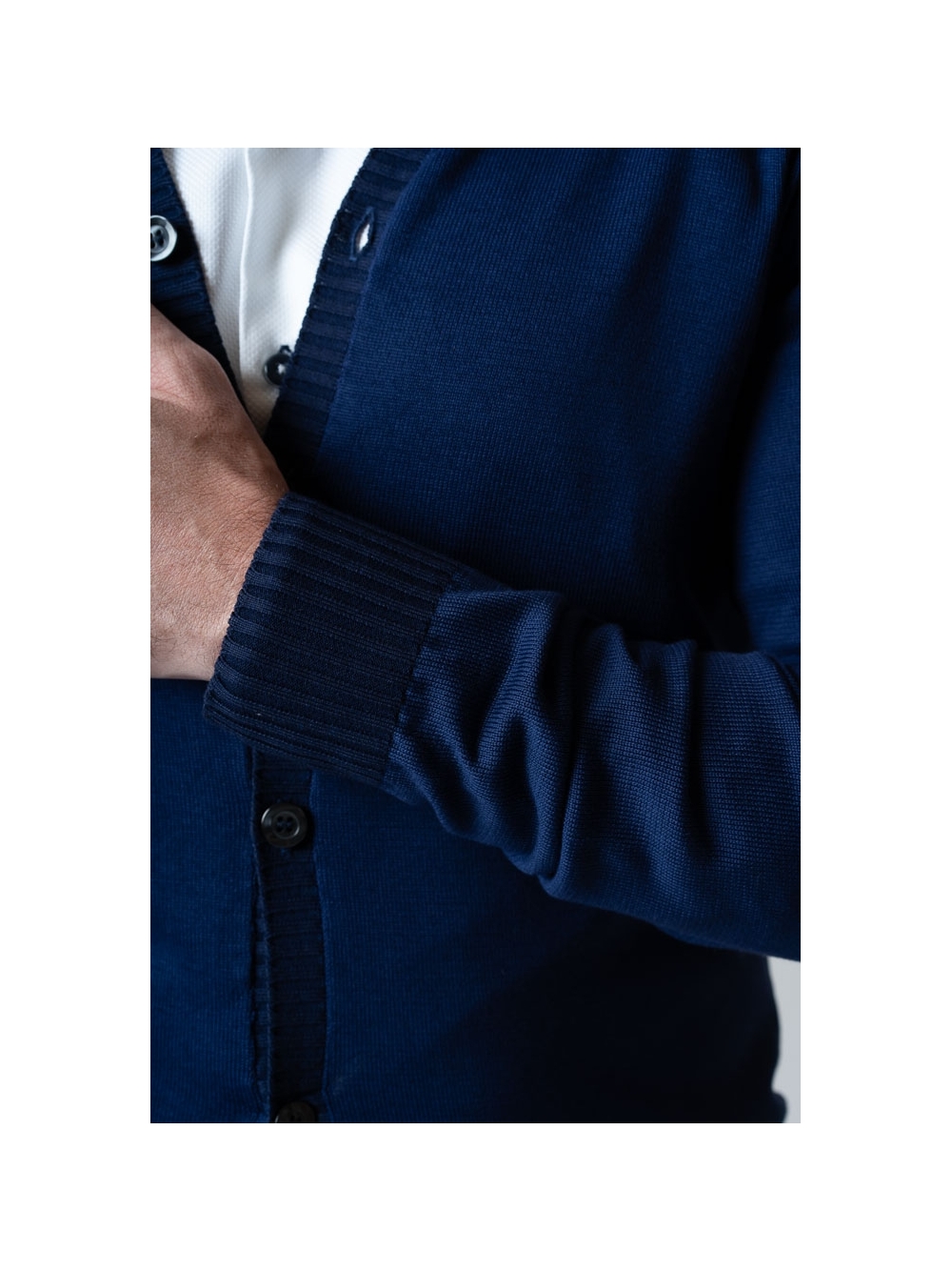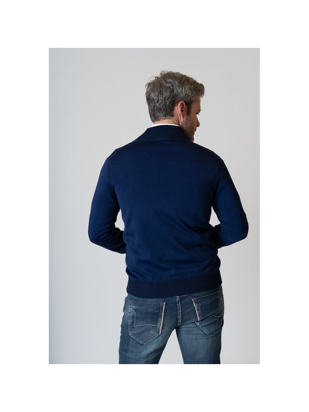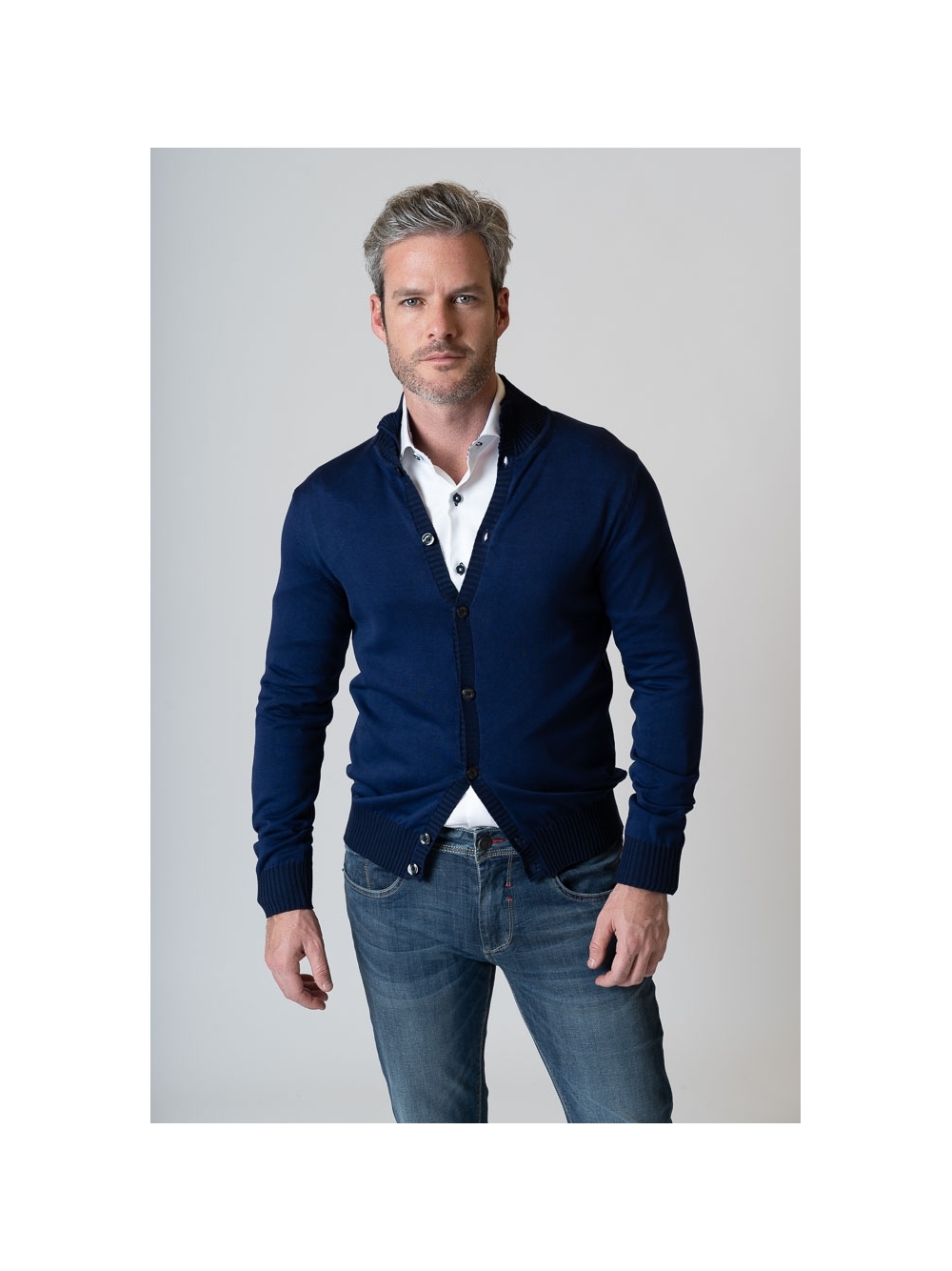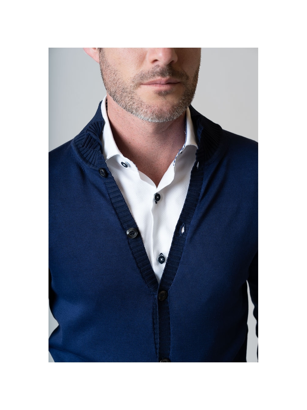 Cardigan uomo con collo a lupetto e chiusura con bottoni , realizzato in 100% cotone tinto capo finezza 7. Un capo molto versatile da indossare sopra la camicia o con una t-shirt , reso ancora più originale dal contrasto di colore tono su tono.