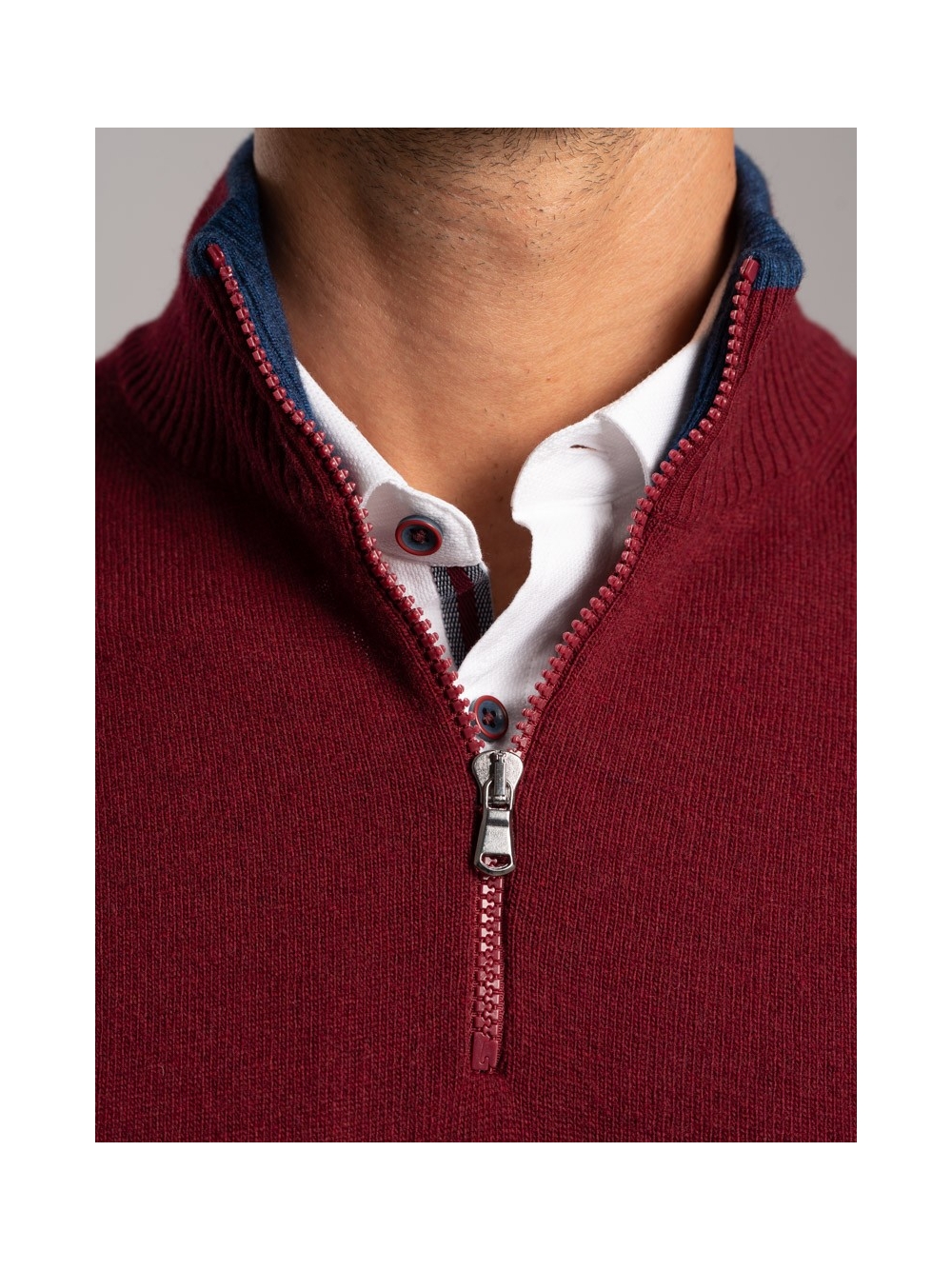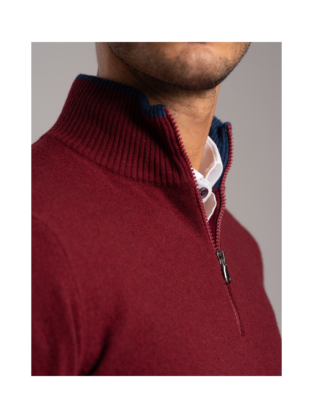 Maglia uomo lupetto misto Cachemire con doppio collo e mezza zip plastica a contrasto.