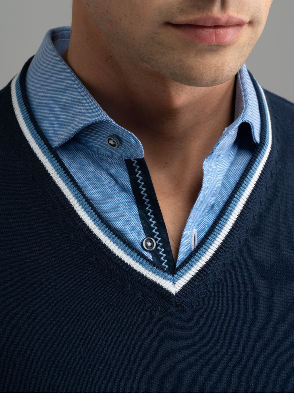 Maglia uomo tinto filo realizzata con filato di cotone crepe pulitissimo che offre una mano fresca e asciutta. Lo scollo a V è impreziosito da linee colorate a contrasto. Questa maglia è disponibile nelle varianti colore blu e tortora