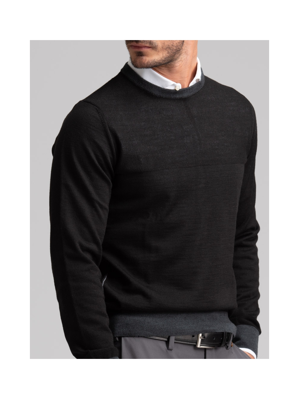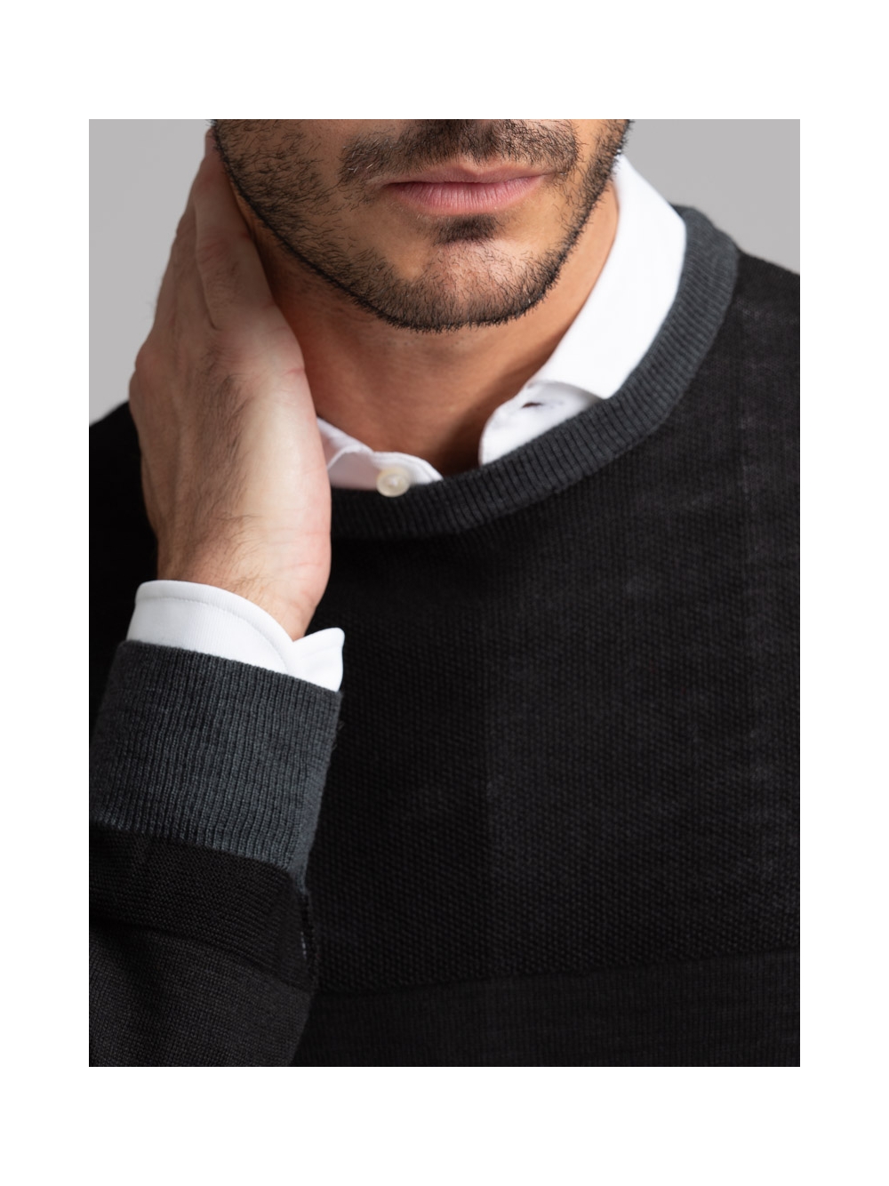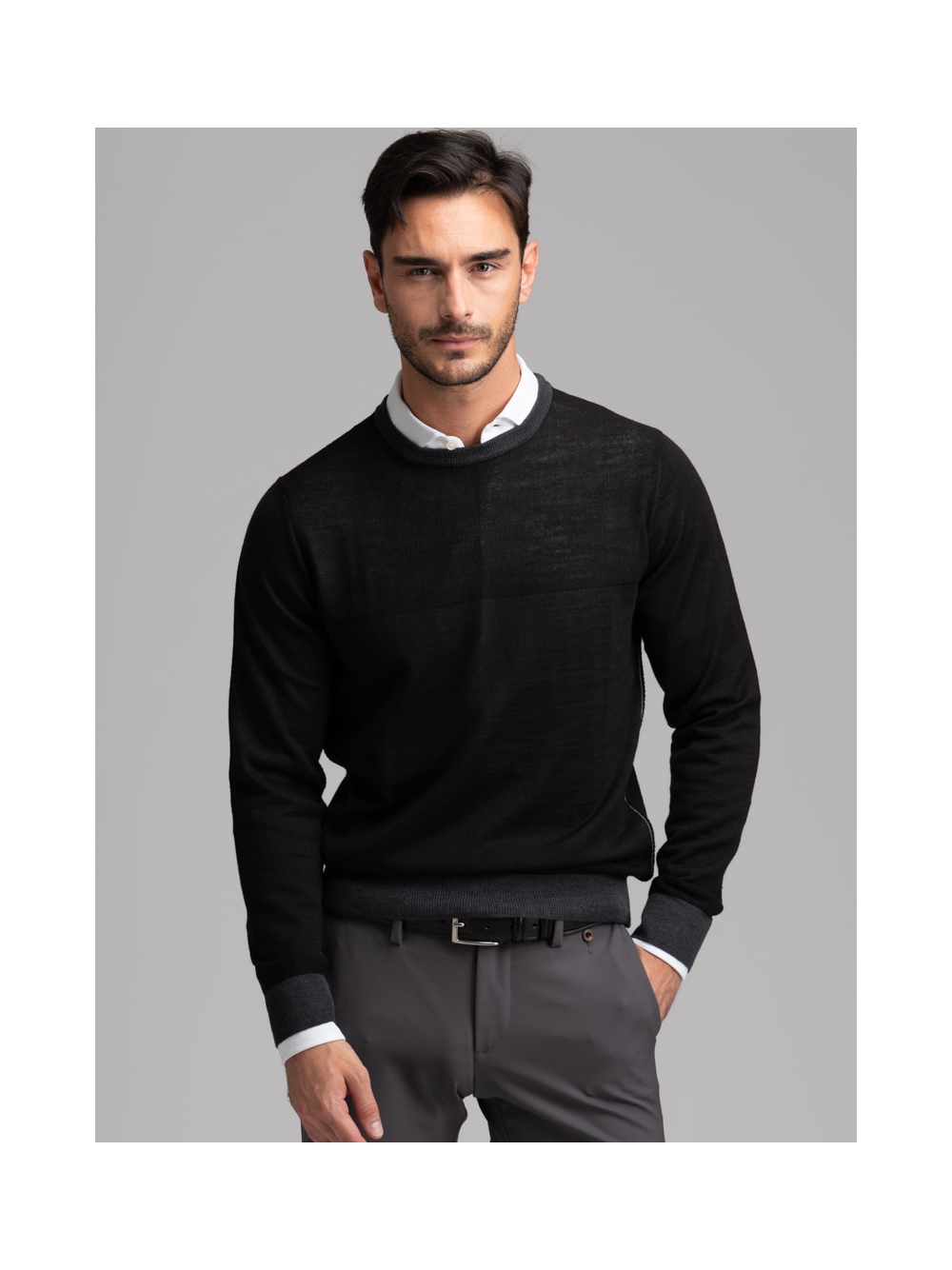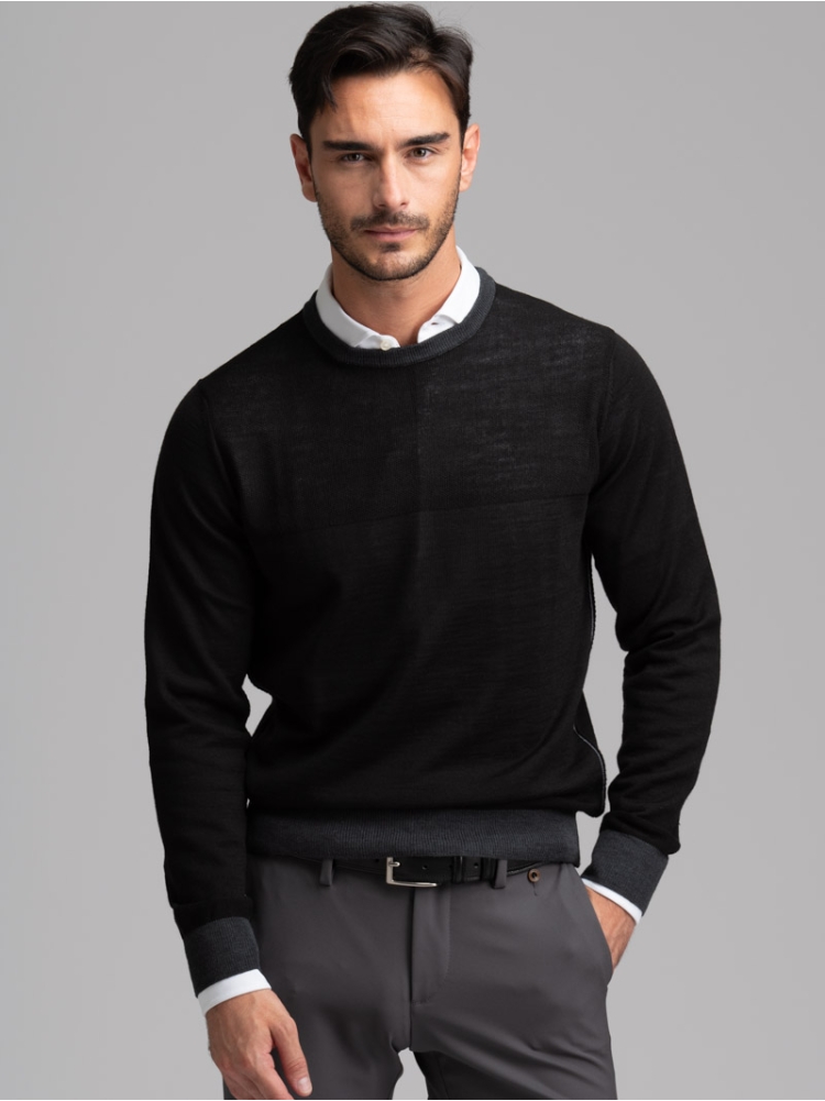 Maglia uomo modello girocollo in misto lana finezza 12, con lavorazione a chicco di riso sul davanti, balza, collo e polsini con cuciture a contrasto.