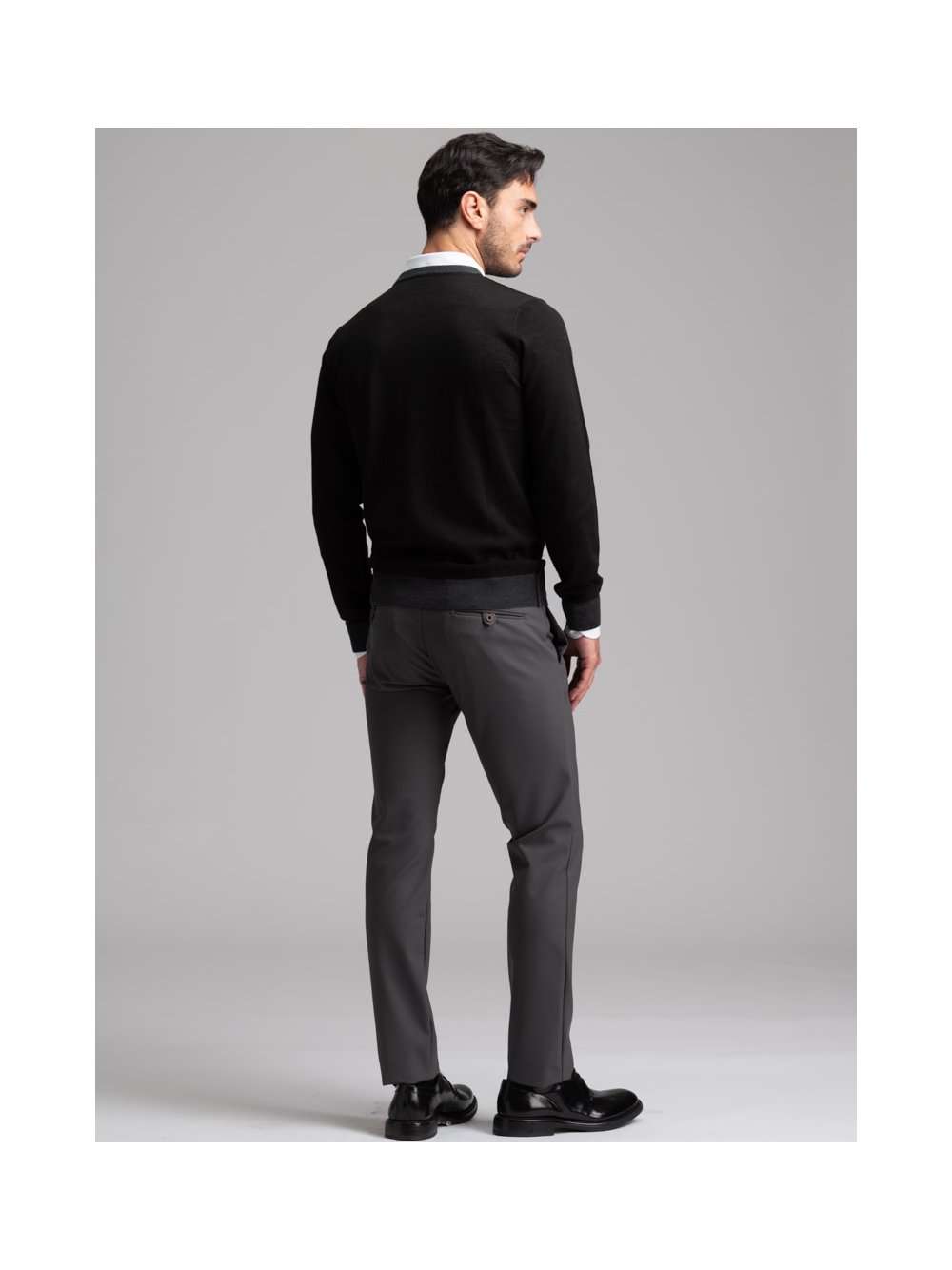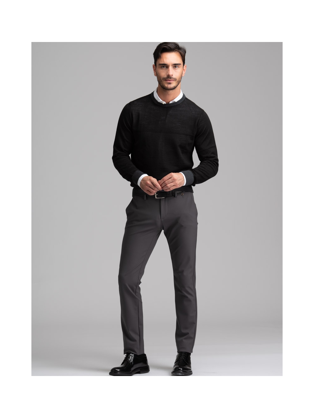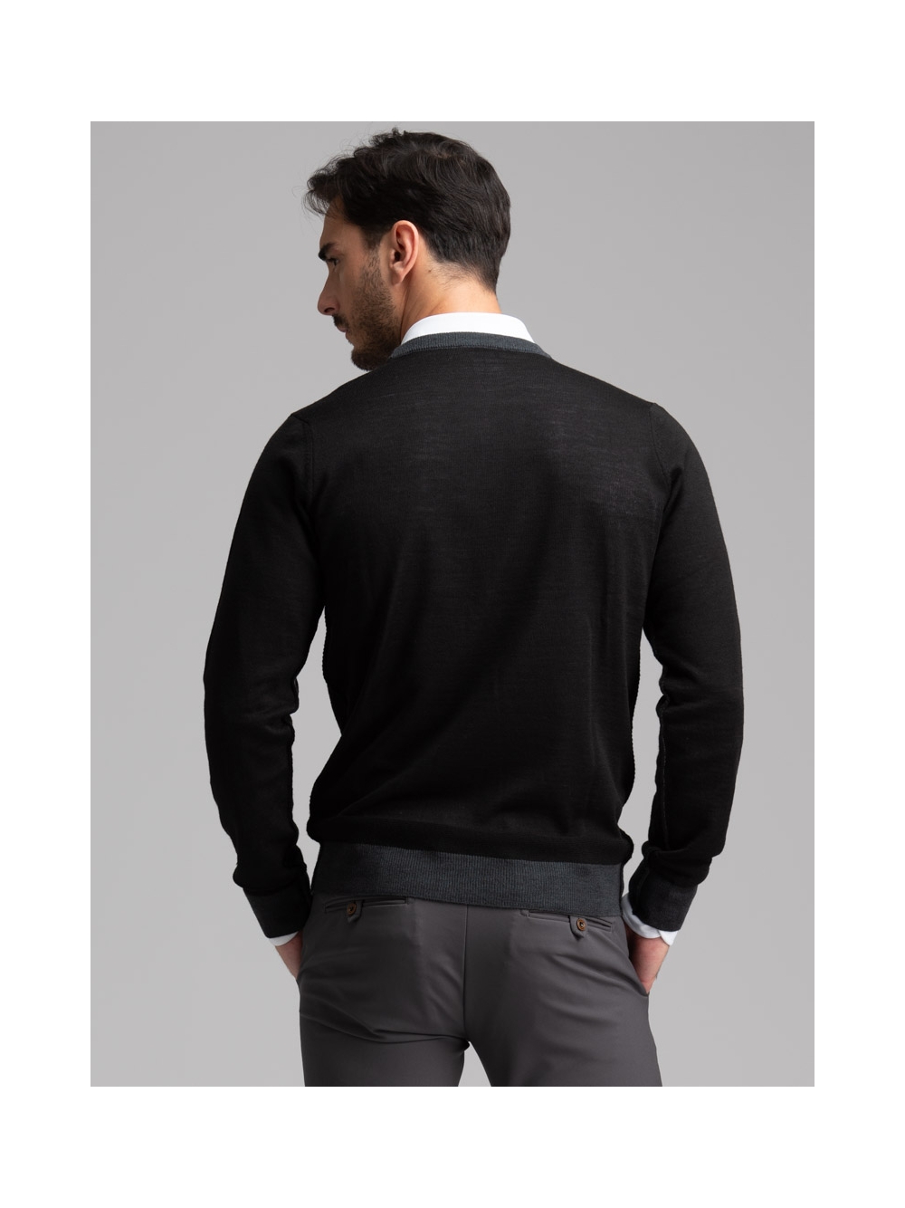 Maglia uomo modello girocollo in misto lana finezza 12, con lavorazione a chicco di riso sul davanti, balza, collo e polsini con cuciture a contrasto.