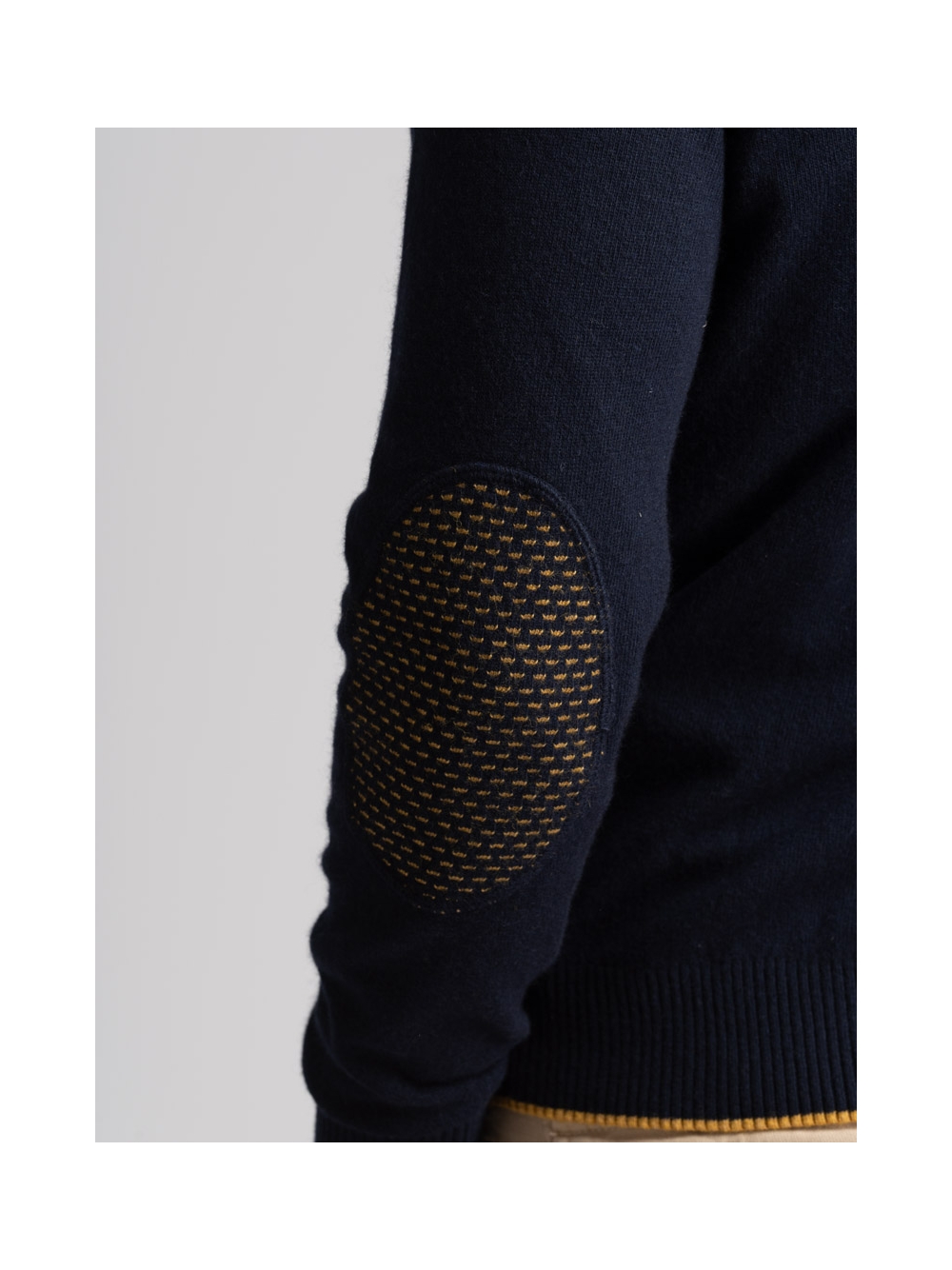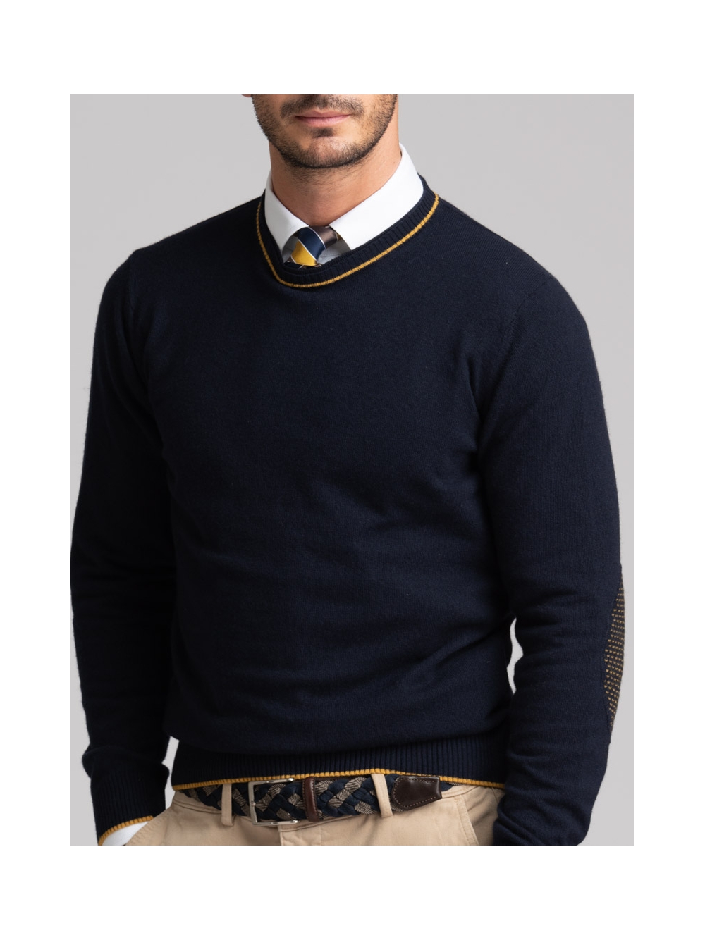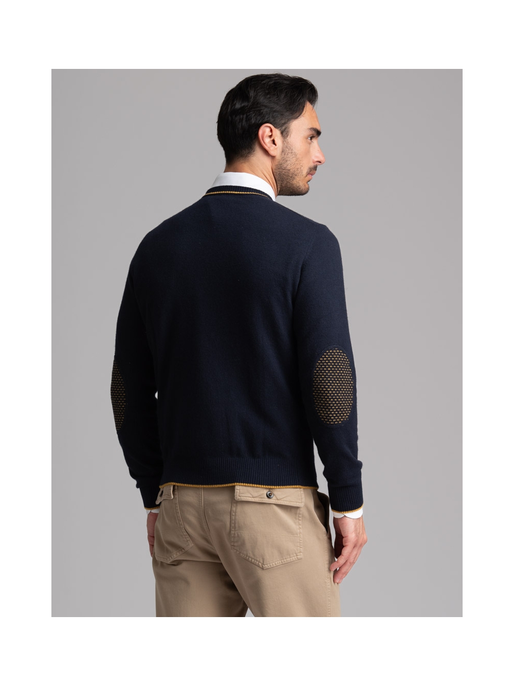Maglia uomo misto Cachemire girocollo rasato, doppio collo con toppe in maglia ad intarsio in contrasto.