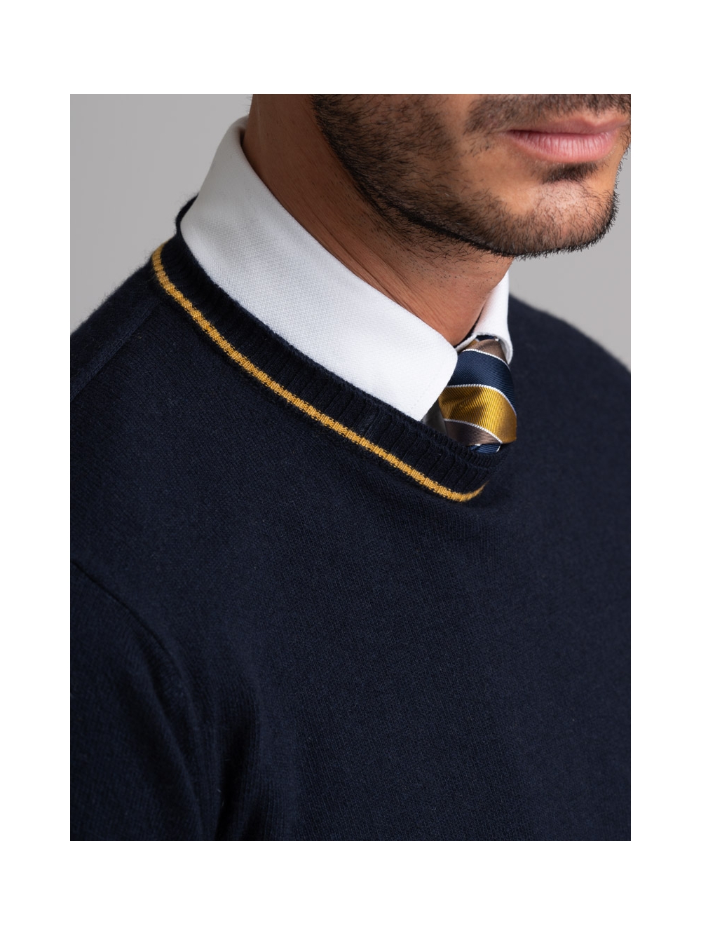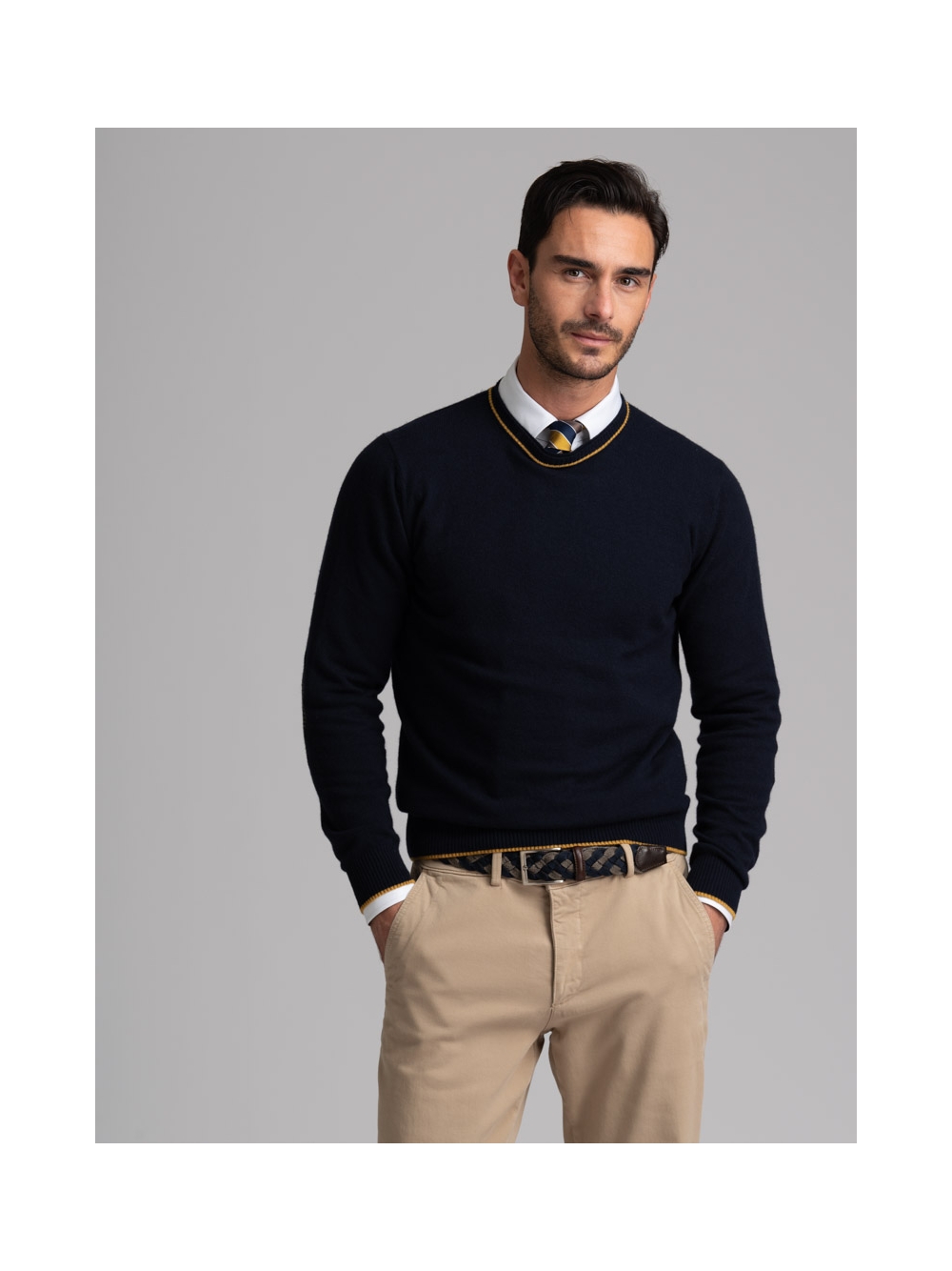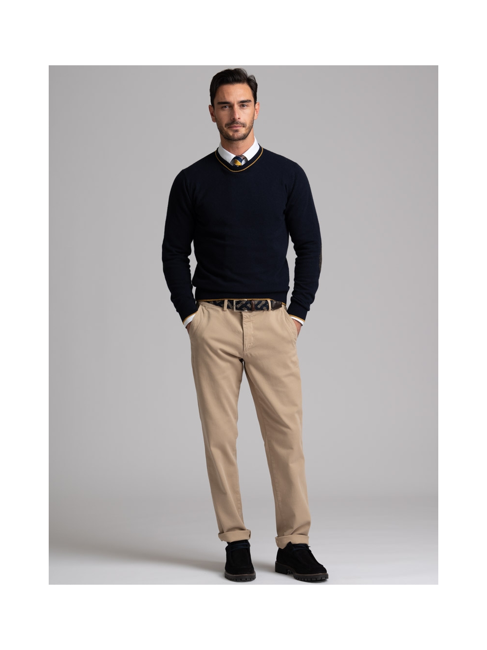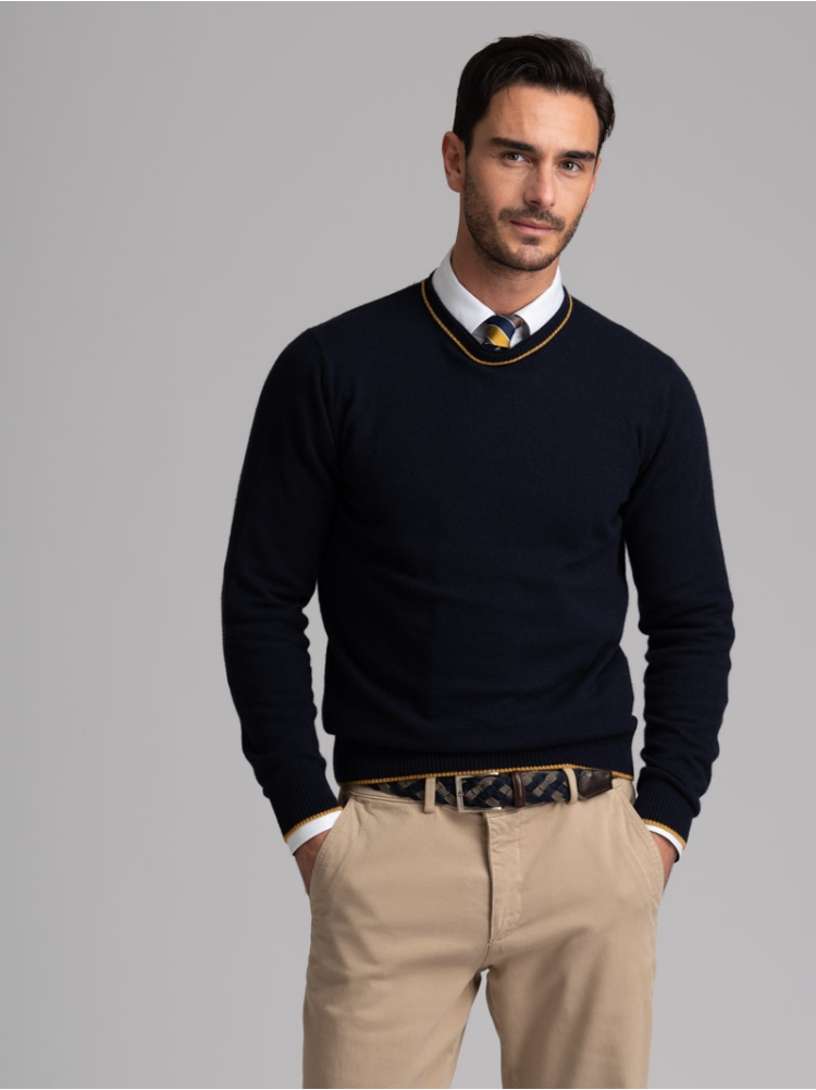 Maglia uomo misto Cachemire girocollo rasato, doppio collo con toppe in maglia ad intarsio in contrasto.
