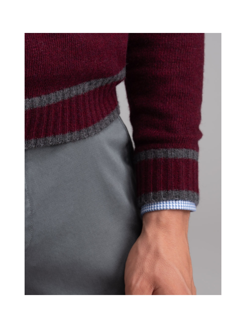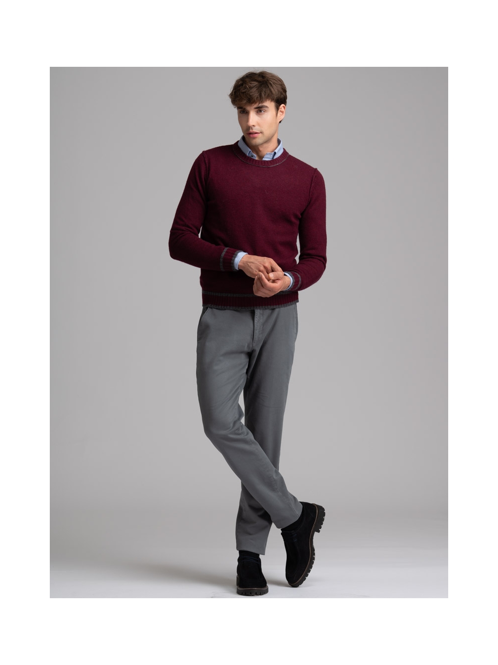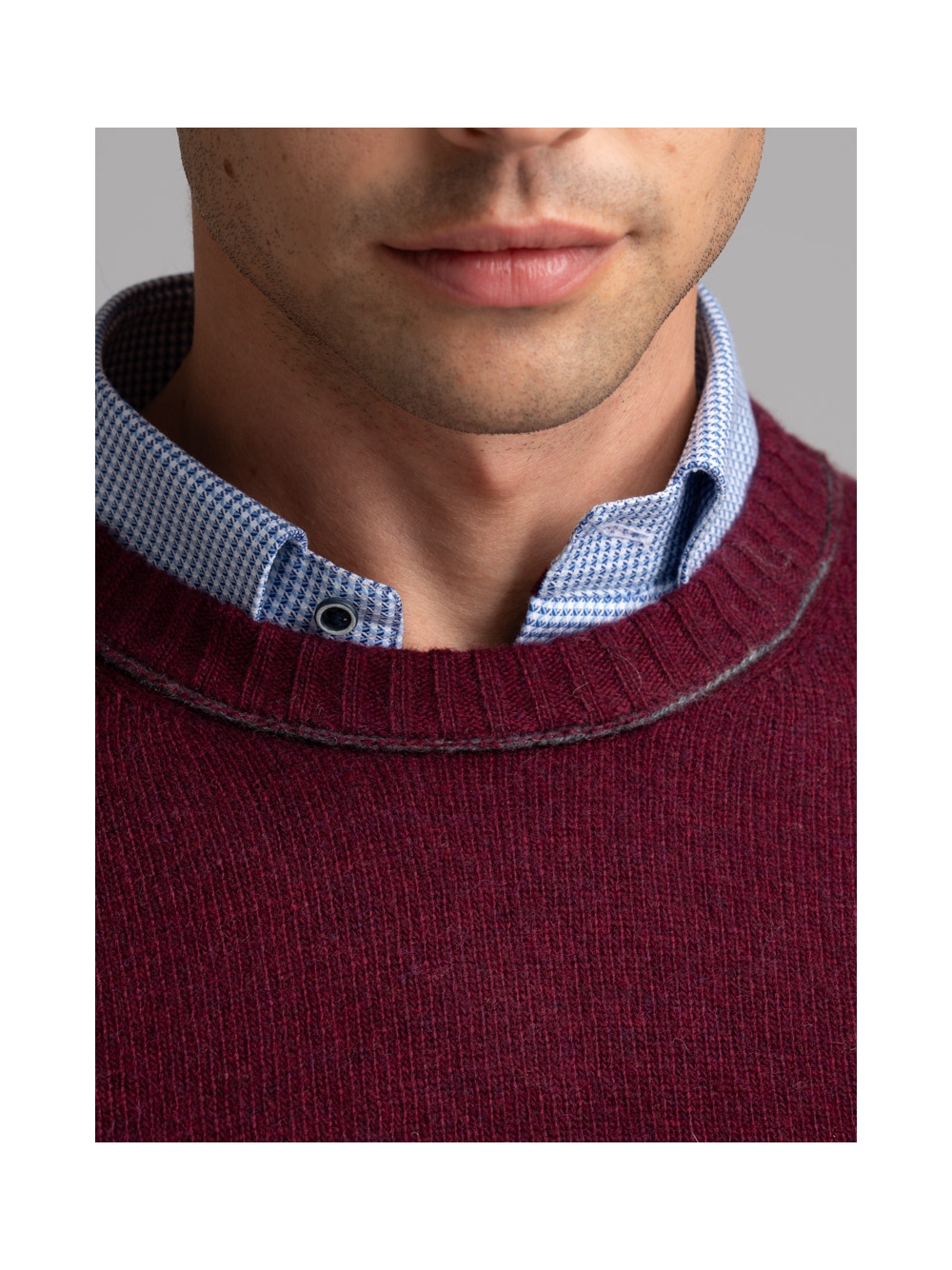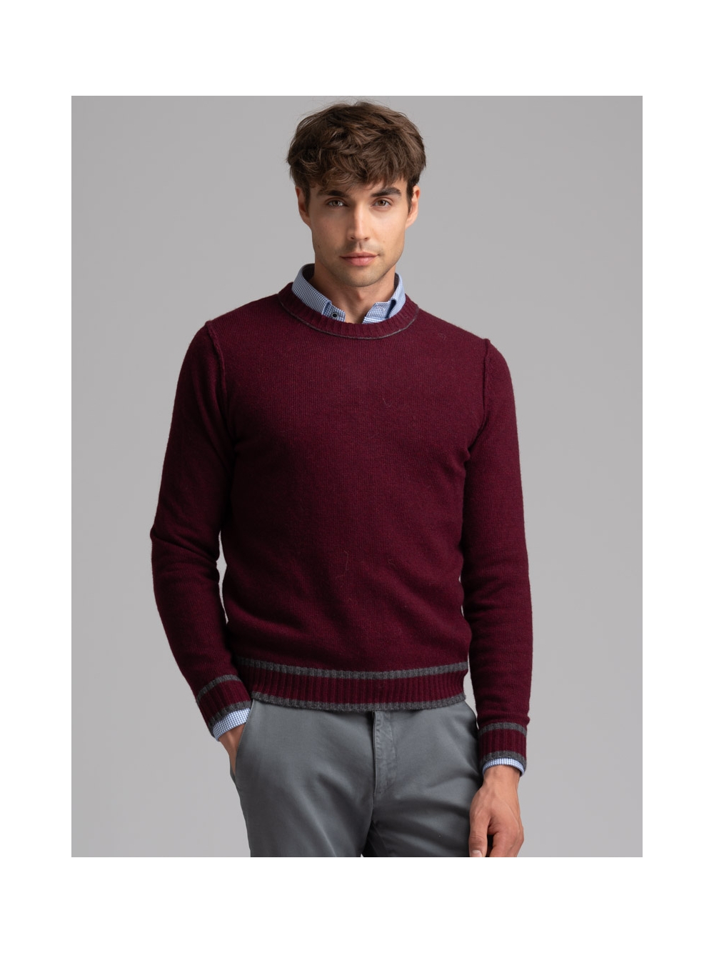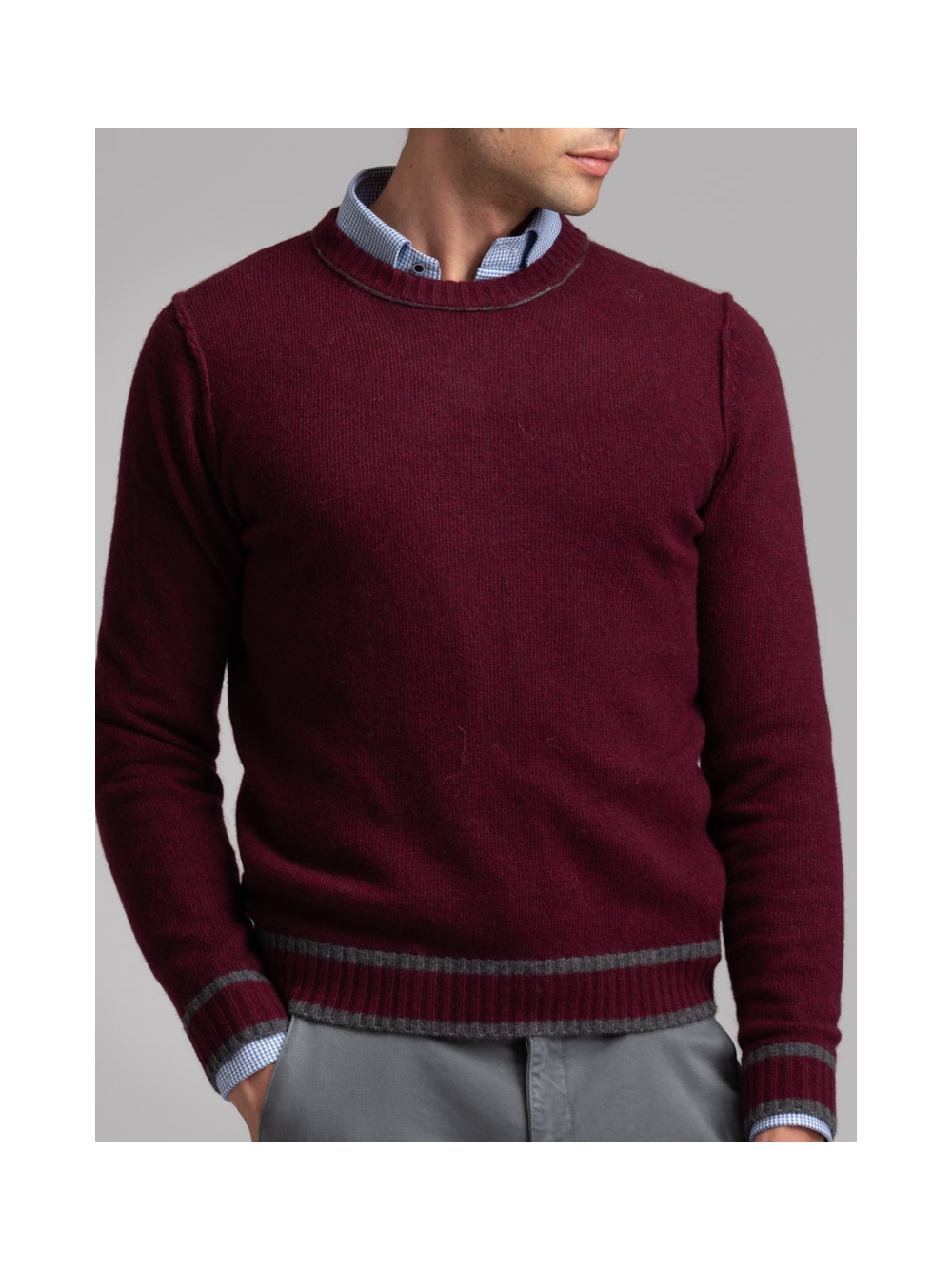 Girocollo uomo in maglia misto lana finezza 7 tinto filo, con giromanica caratterizzato da cuciture rovesciate, polsi e balza in maglia con lavorazione a coste. Il collo presenta una cucitura a contrasto blu per la variante grigia, mentre il modello color bordeaux ha inserti color grigio.