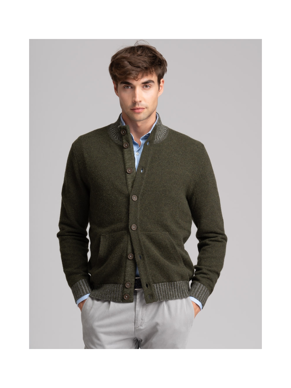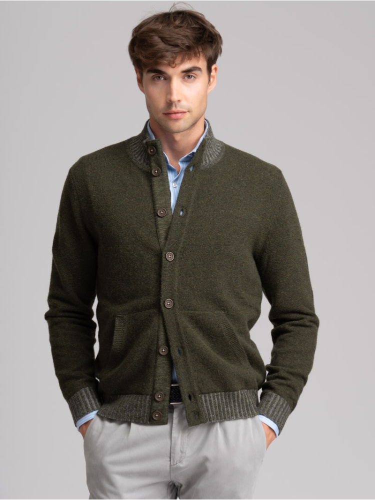 Giubbino uomo in maglia misto lana finezza 7 tinto filo, caratterizzato da una chiusura con bottoni a contrasto, tasche a marsupio, collo e balza sul fondo in maglia a costina vanisè, toppe color denim per la variante blu, e tono su tono per il modello nel colore verde.
