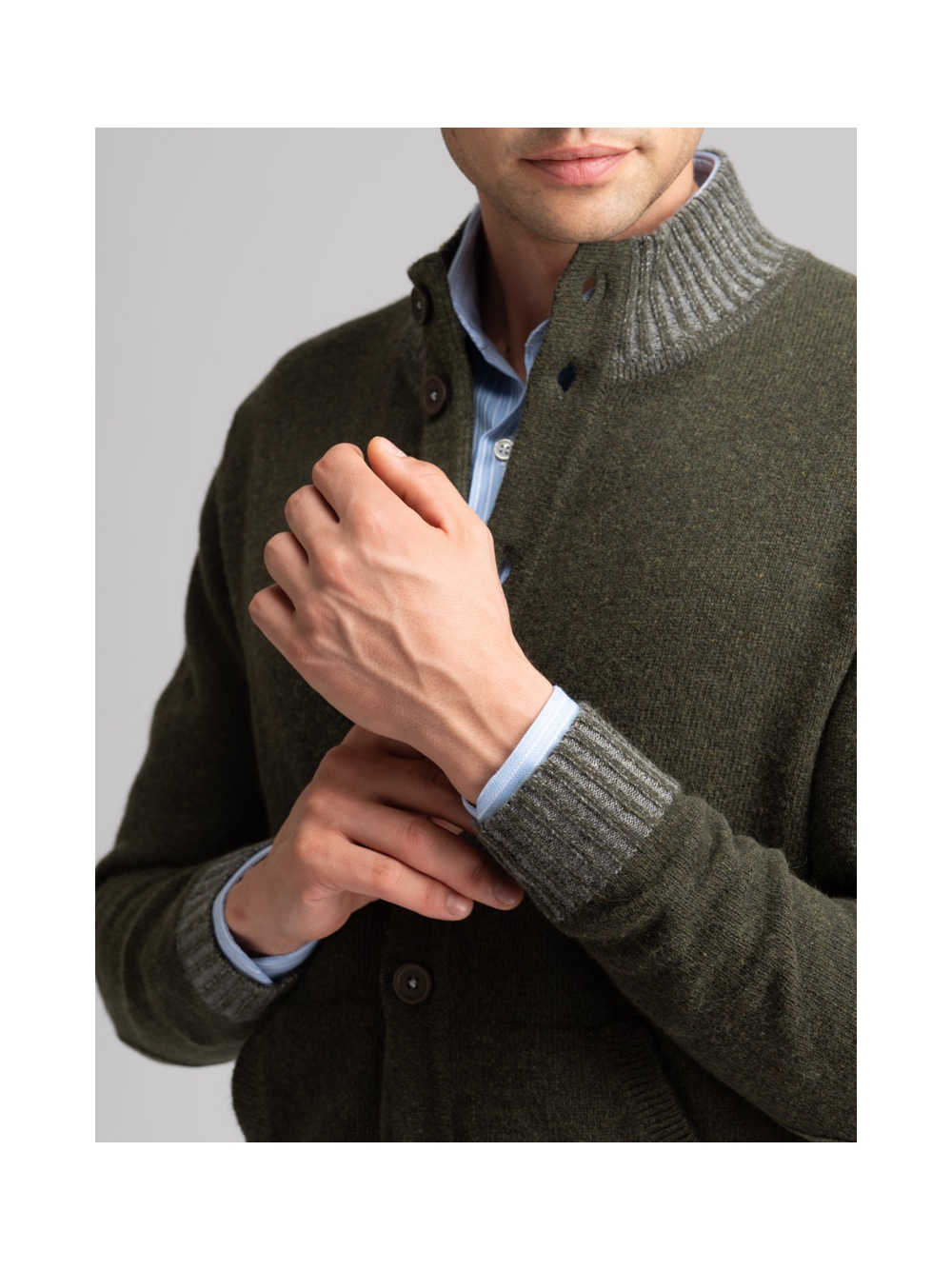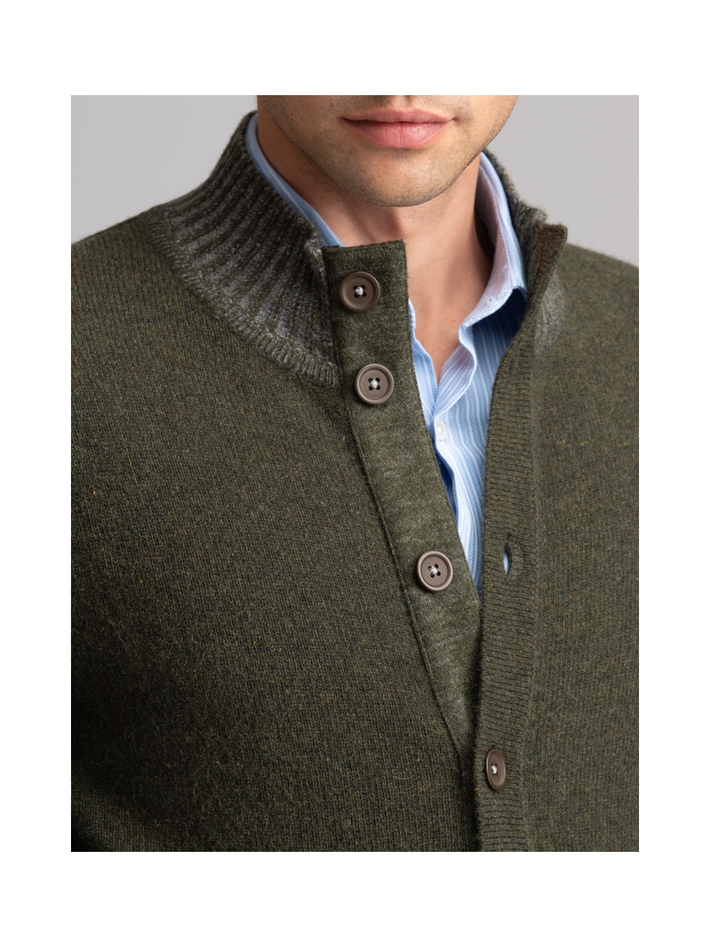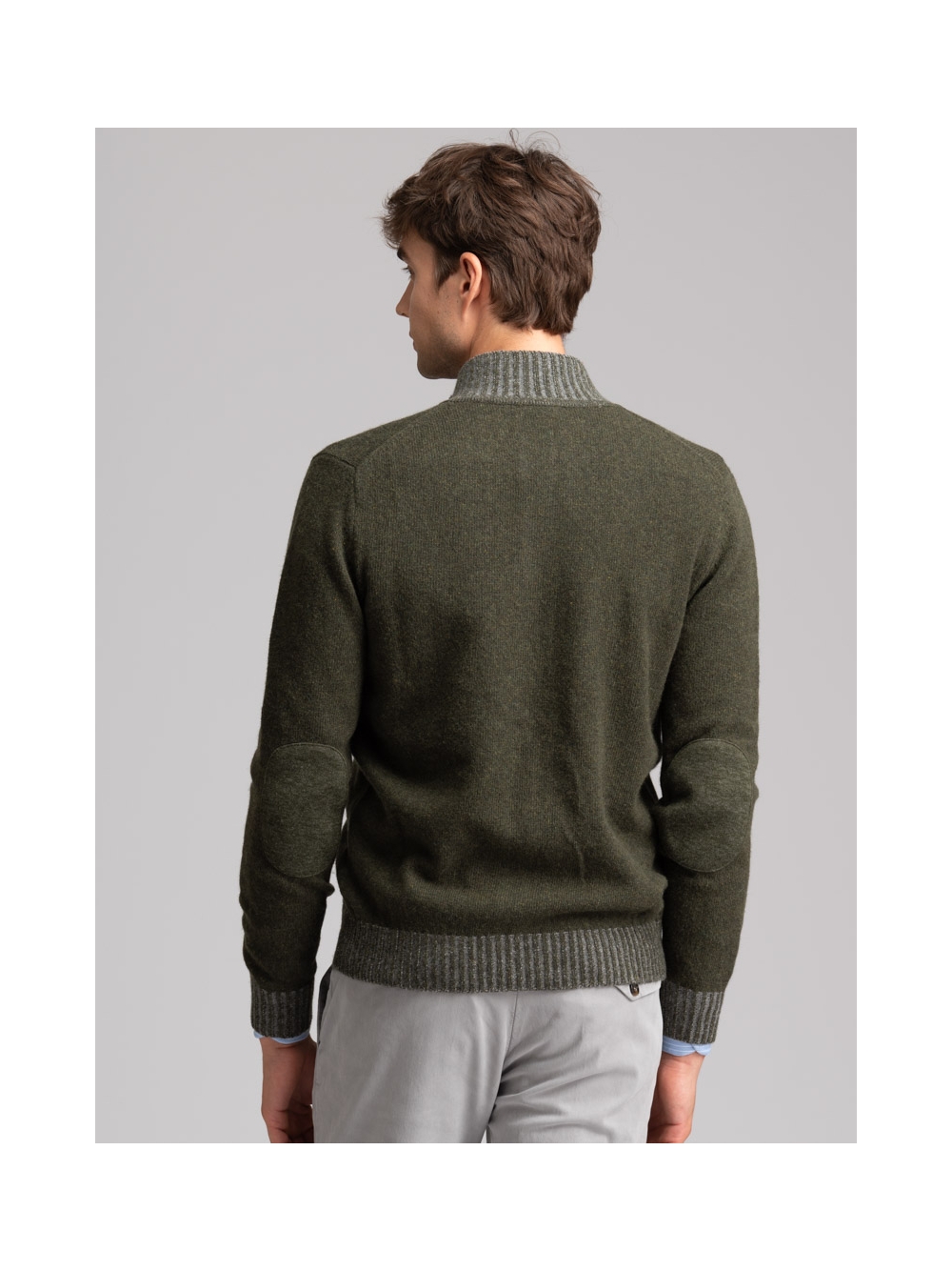 Maglia uomo modello giubbino con bottoni, toppe e inserti in maglia a costine vanisè, realizzato in maglia misto lana finezza 7.