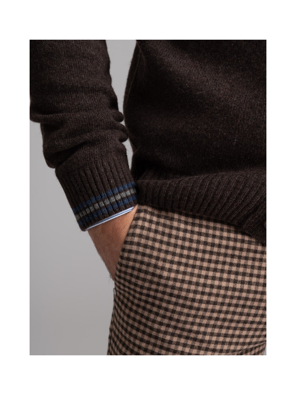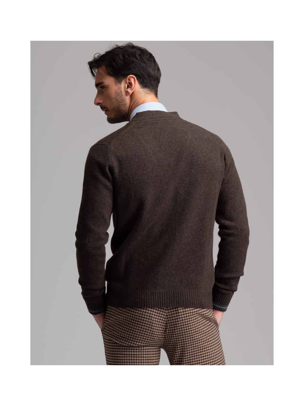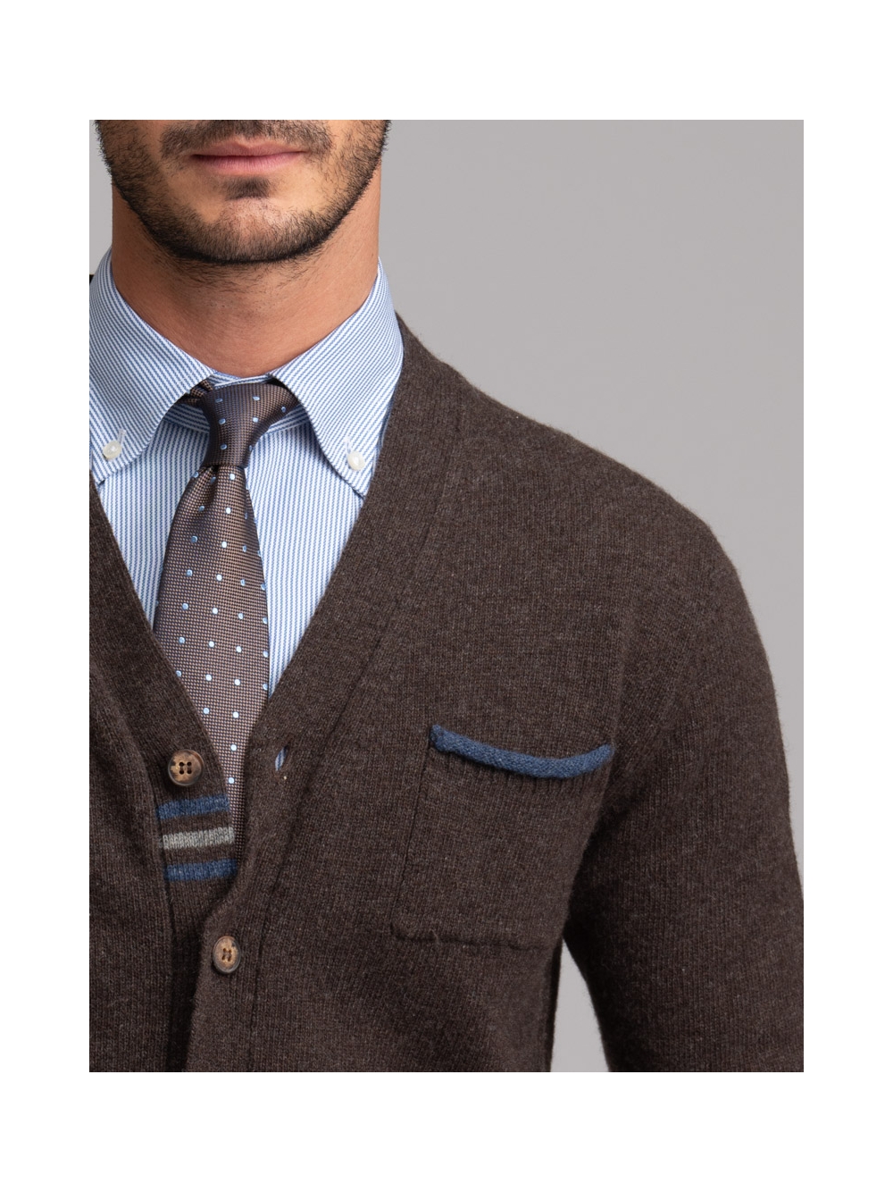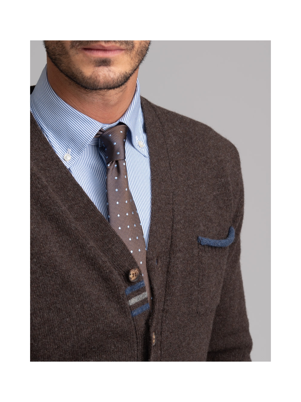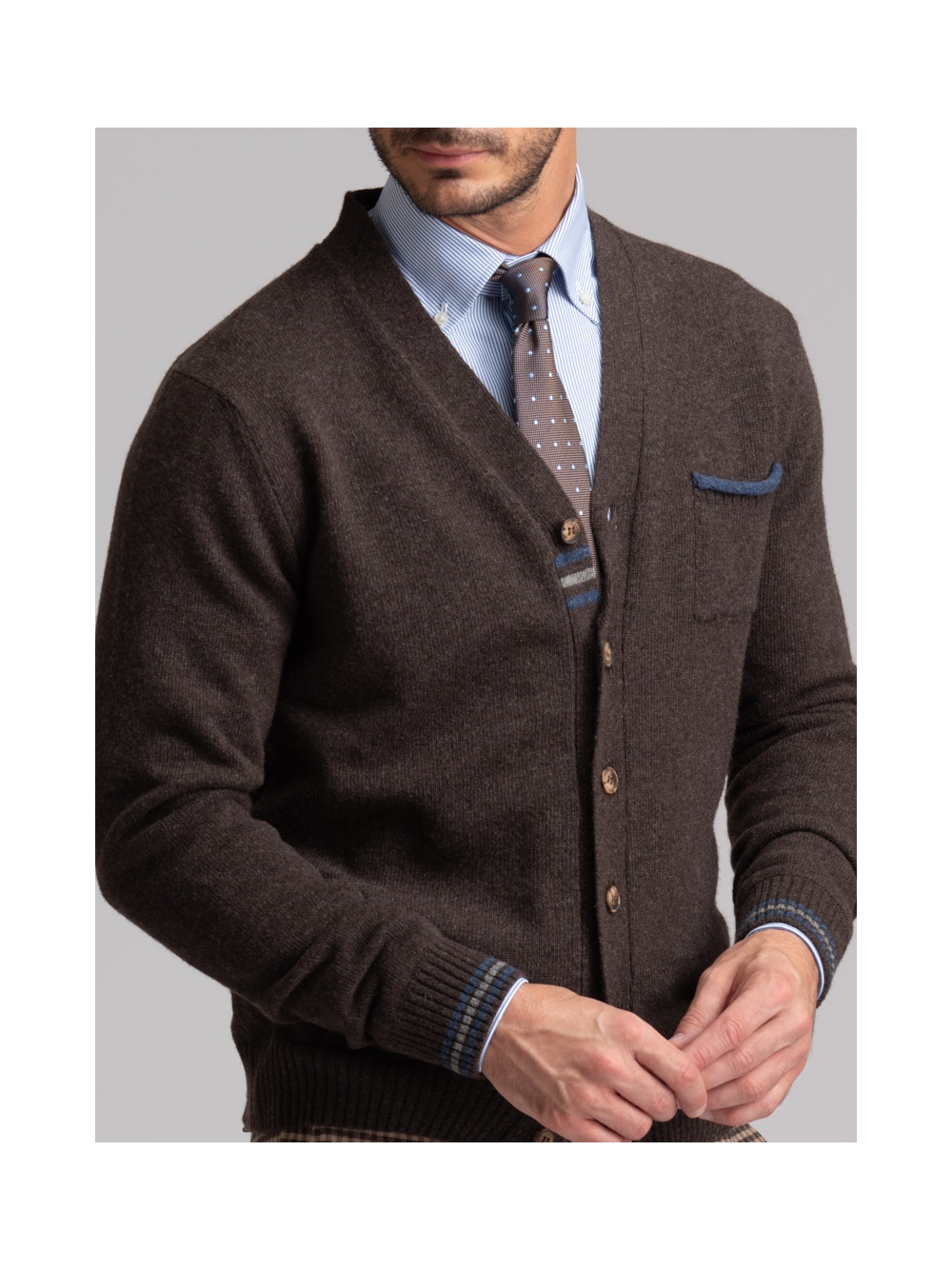 Maglia uomo modello cardigan con bottoni e taschina, realizzato in maglia misto lana finezza 7 con inserti colorati a contrasto.