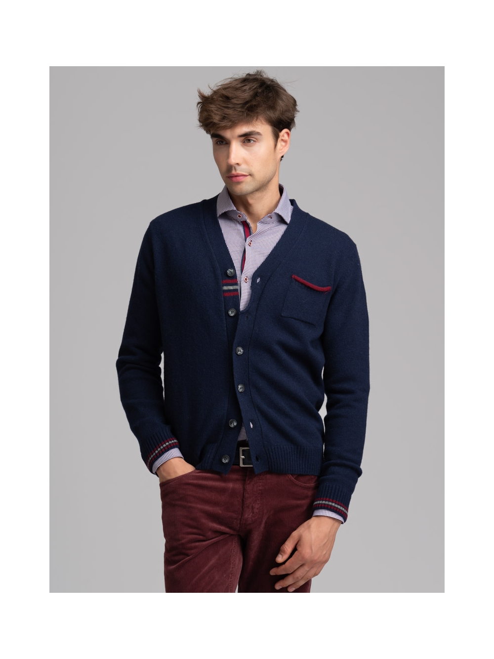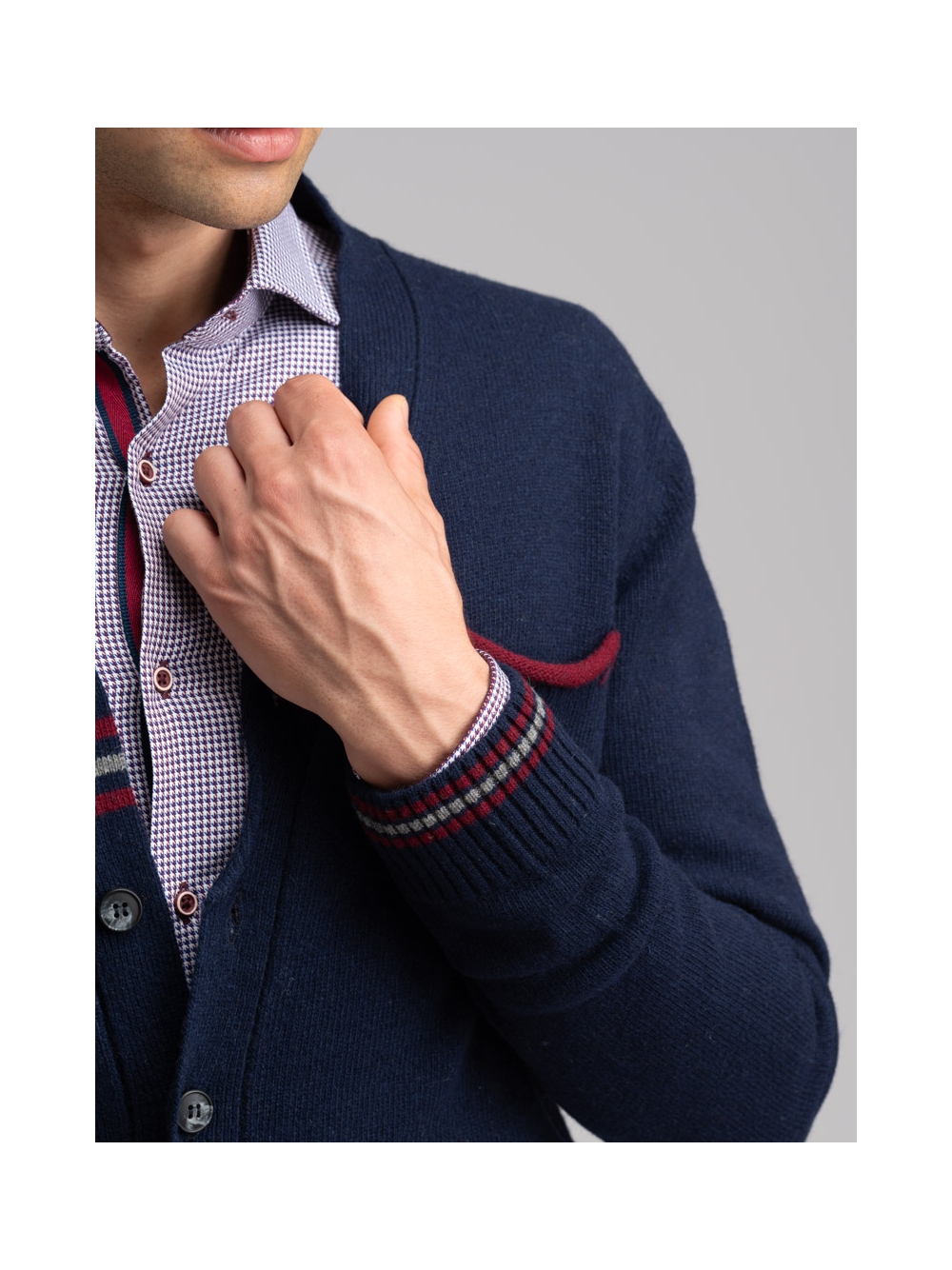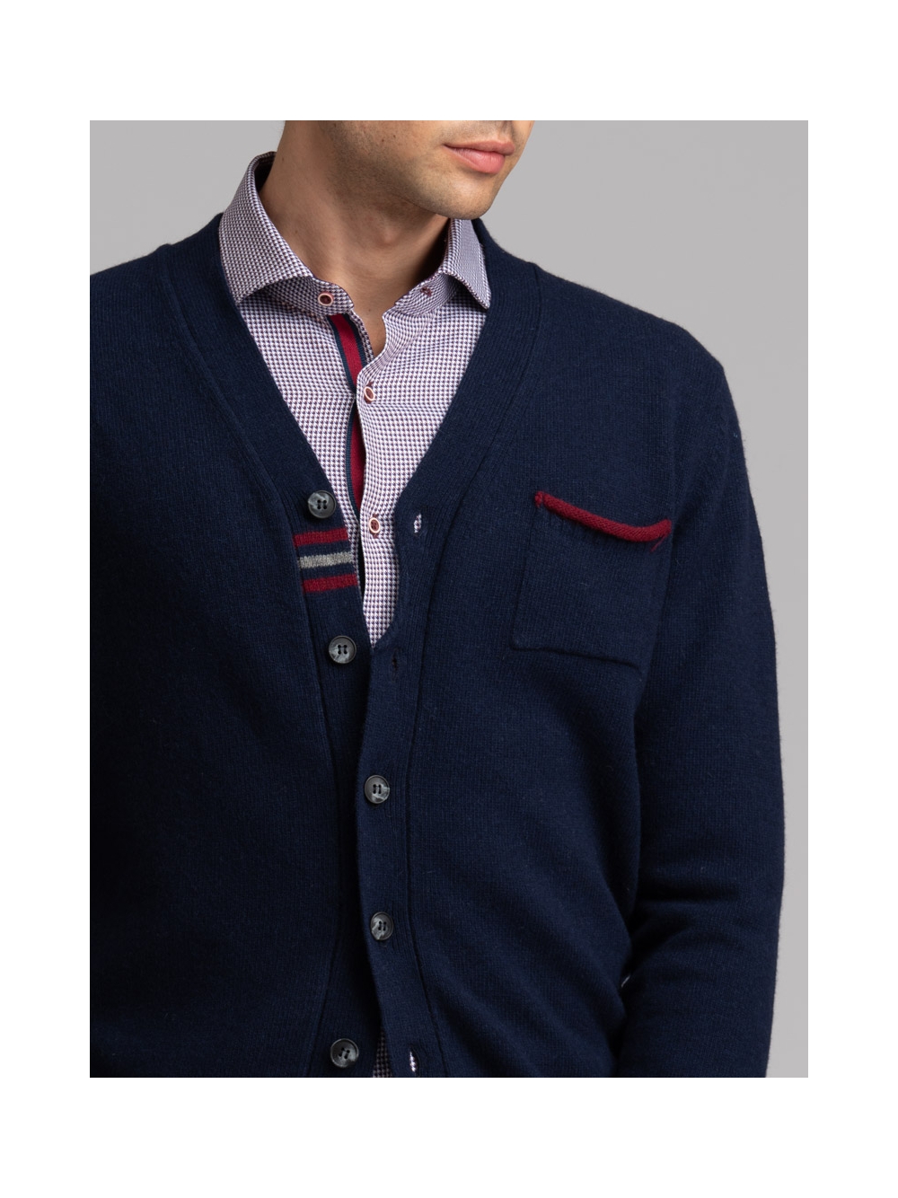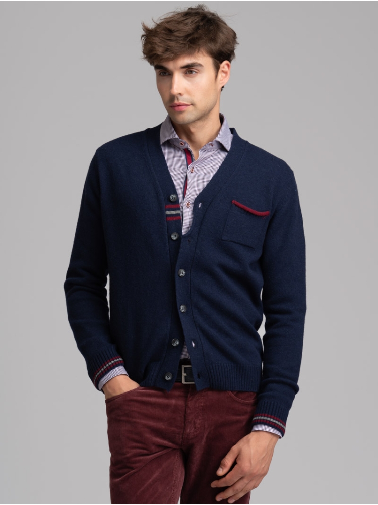 Maglia uomo modello cardigan con bottoni e taschina, realizzato in maglia misto lana finezza 7 con inserti colorati a contrasto.