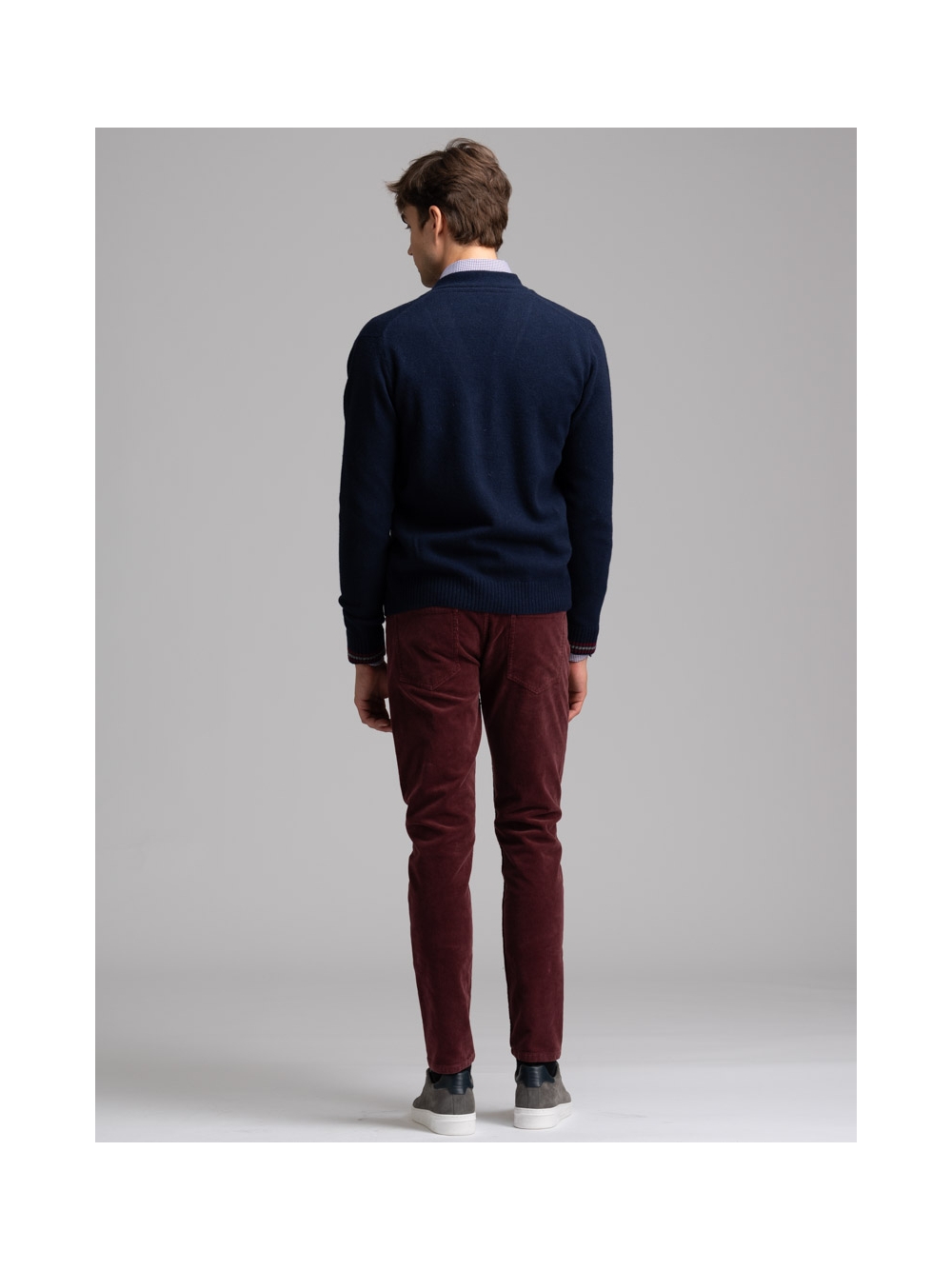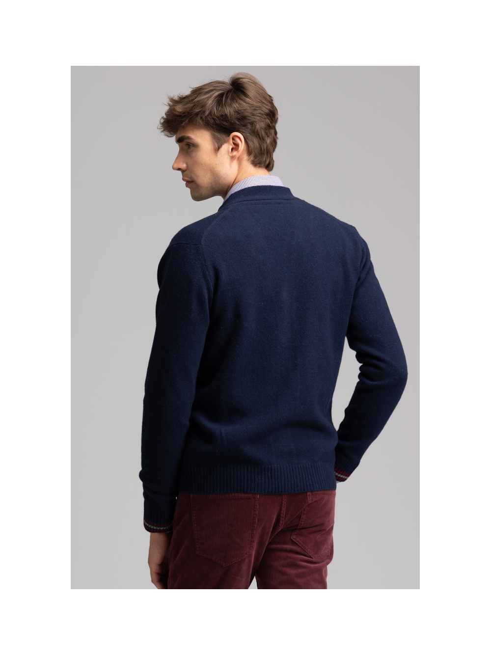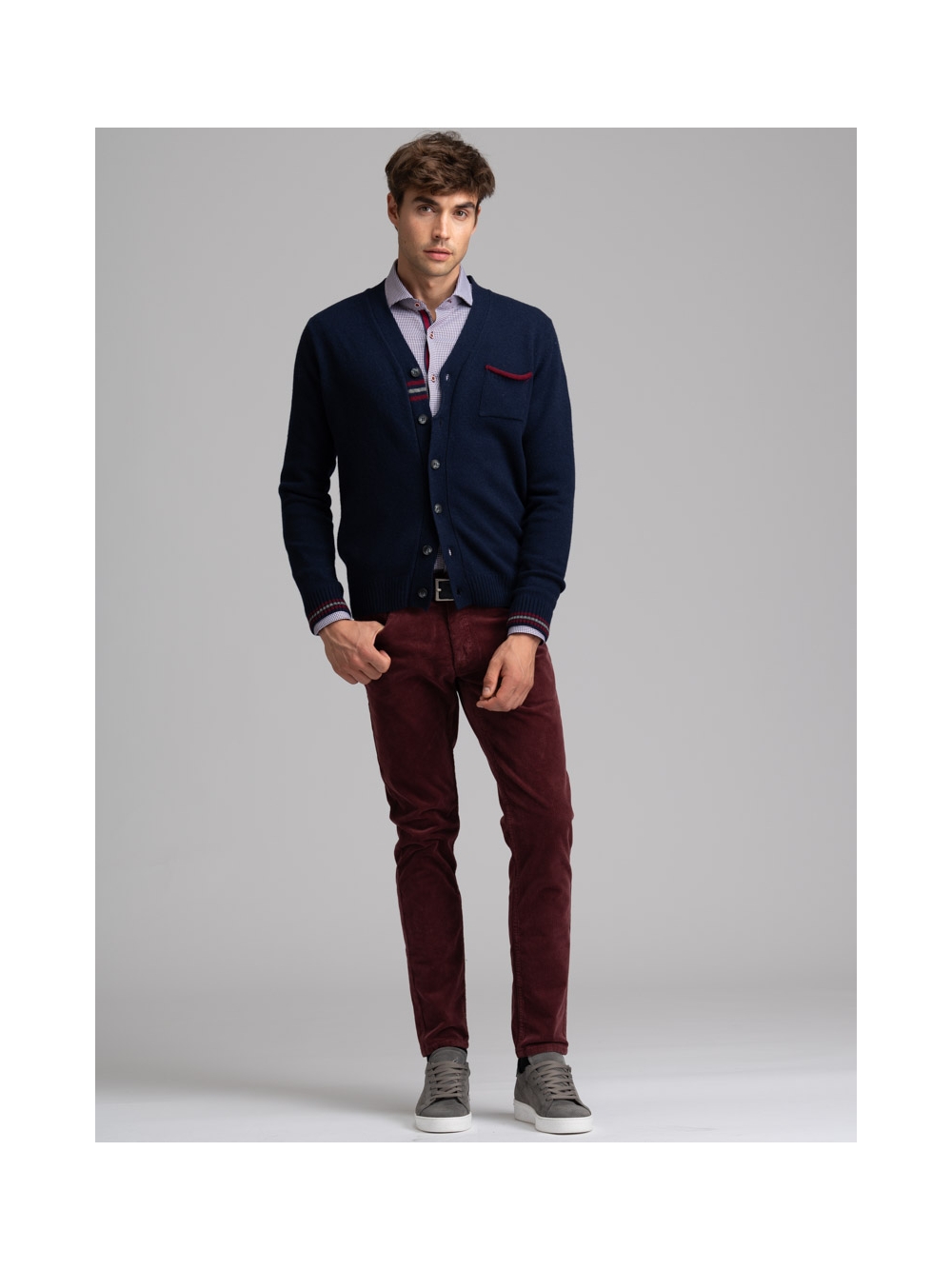 Maglia uomo modello cardigan con bottoni e taschina, realizzato in maglia misto lana finezza 7 con inserti colorati a contrasto.