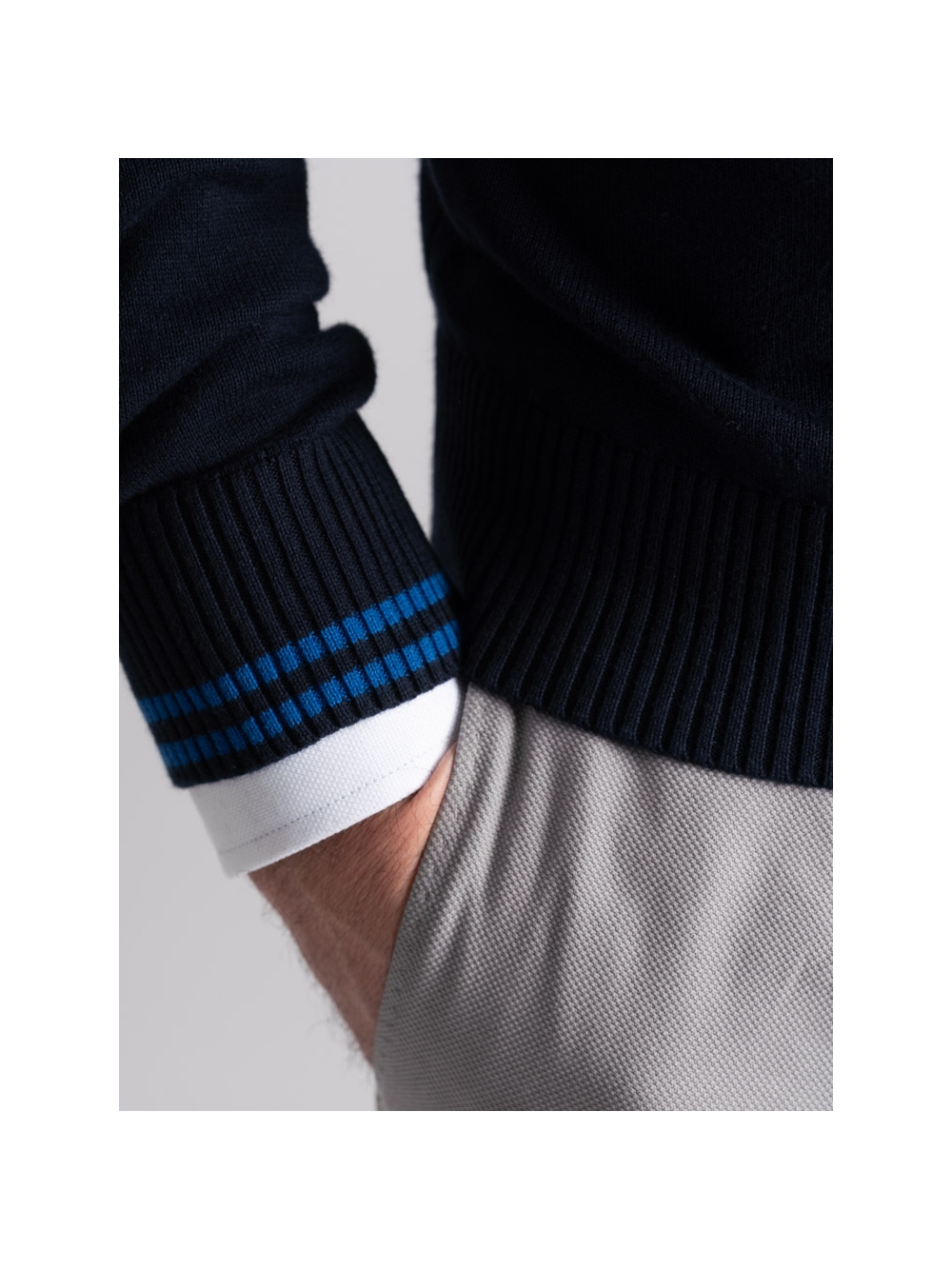 Maglia uomo a manica lunga con scollo a V, 100% cotone finezza 12 tinta unita nelle varianti colore blu e verde militare. Questa maglia è caratterizzata da un rib doppio a contrasto sul collo, cuciture fatte a rovescio sulle spalle che richiamano l’effetto felpa, che danno grinta alla classica maglia.
