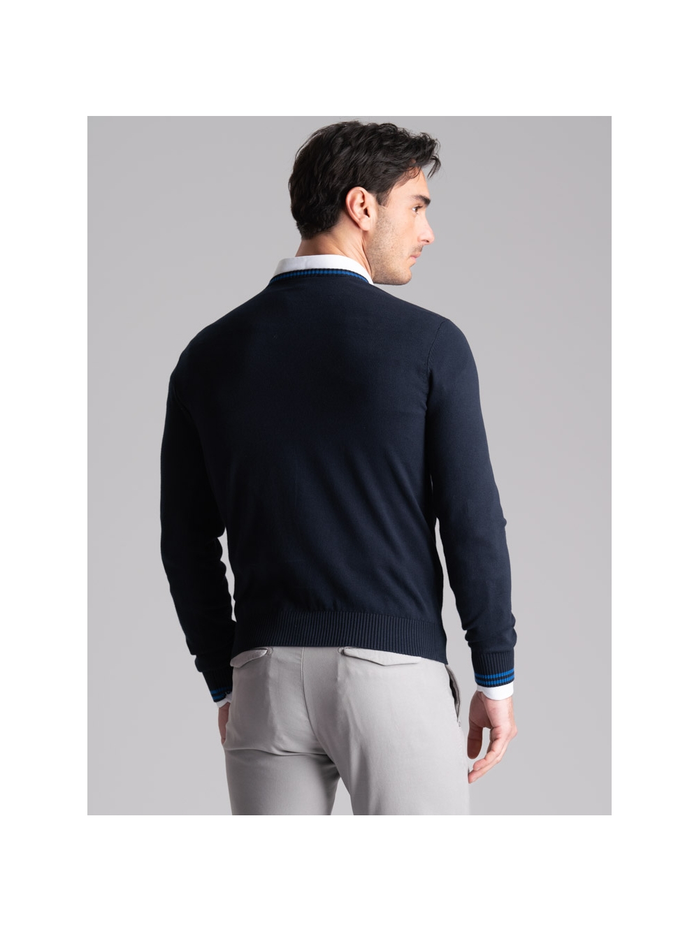 Maglia uomo con scollo a V a manica lunga in cotone tinta unita con contrasti colore sul collo e cuciture al rovescio sulle spalle.