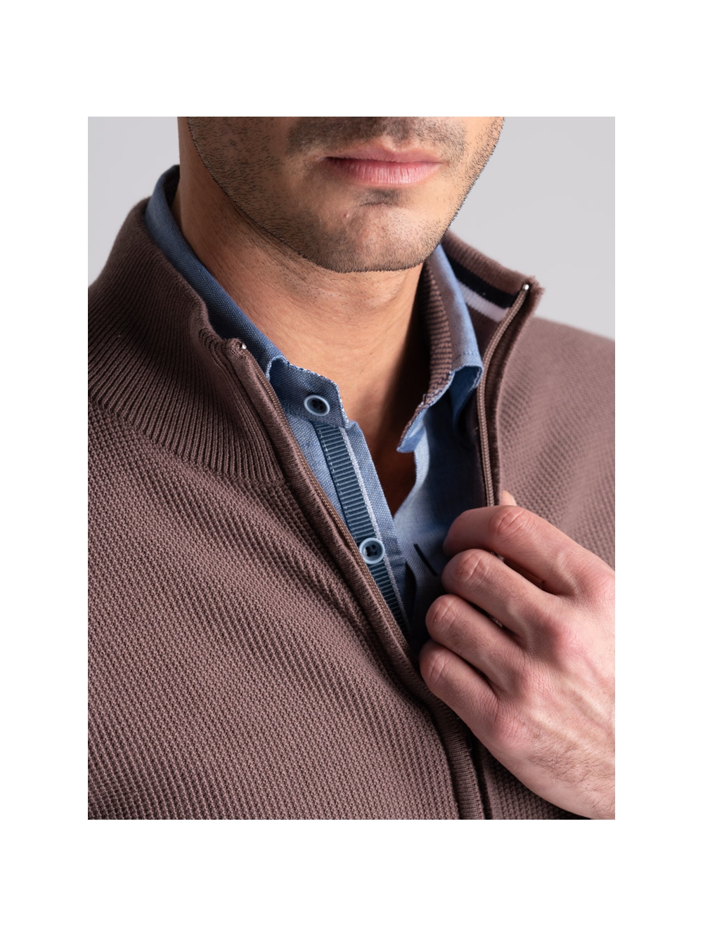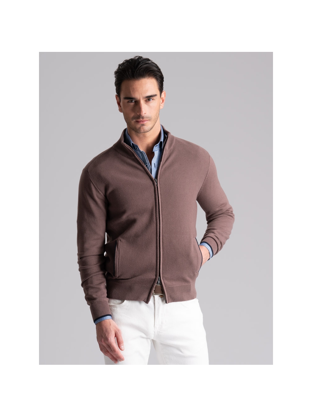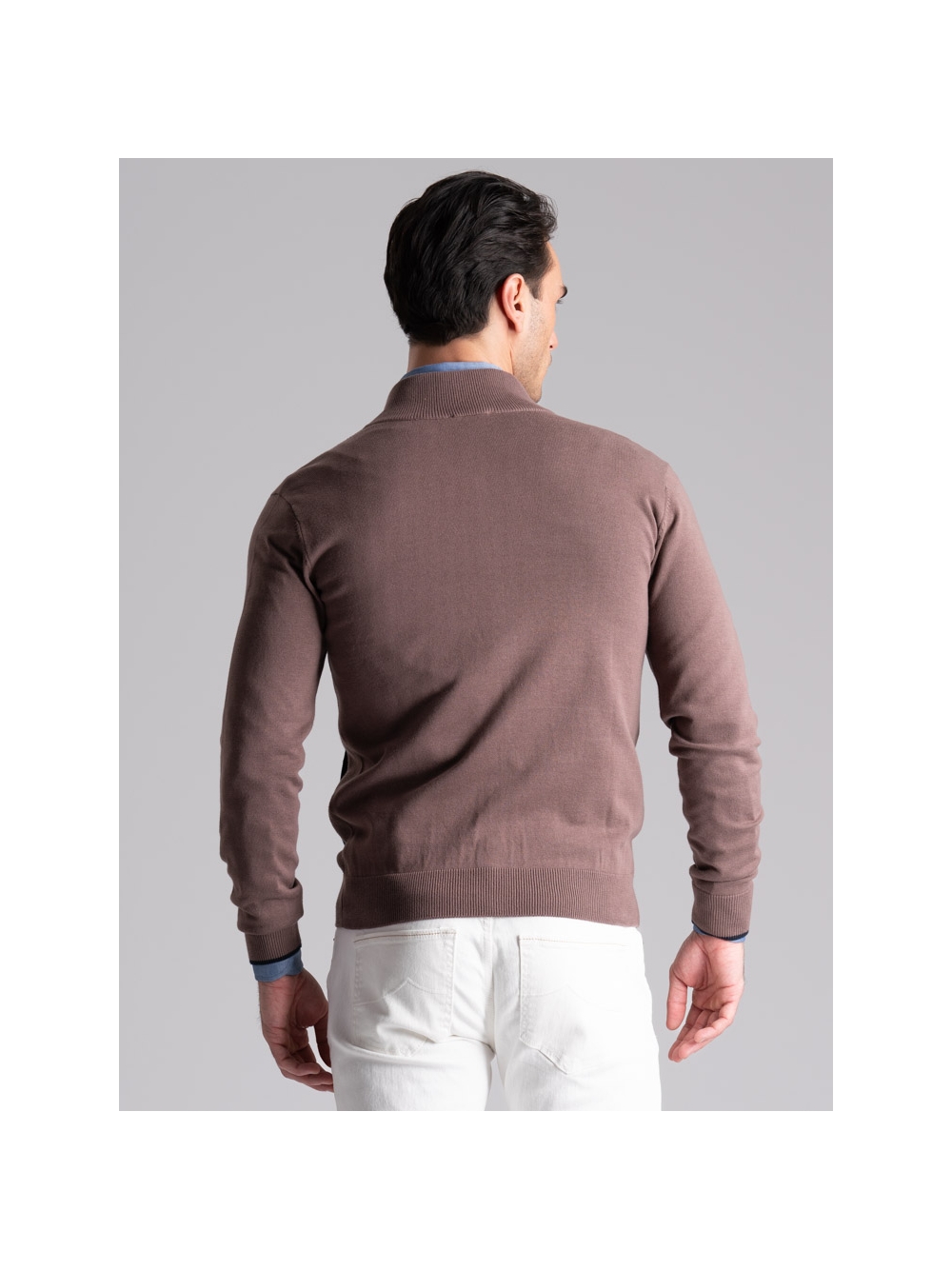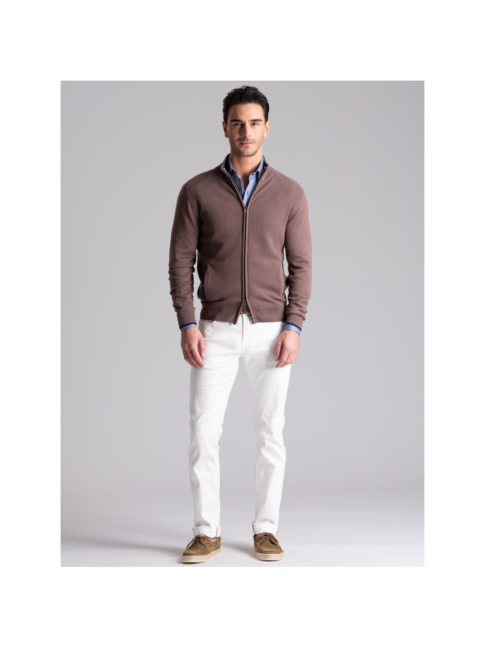 Maglia uomo modello full zip con tasche, in maglia di cotone tinta unita finezza 12, contrasti su collo e taschino e lavorazione a chicco di riso.