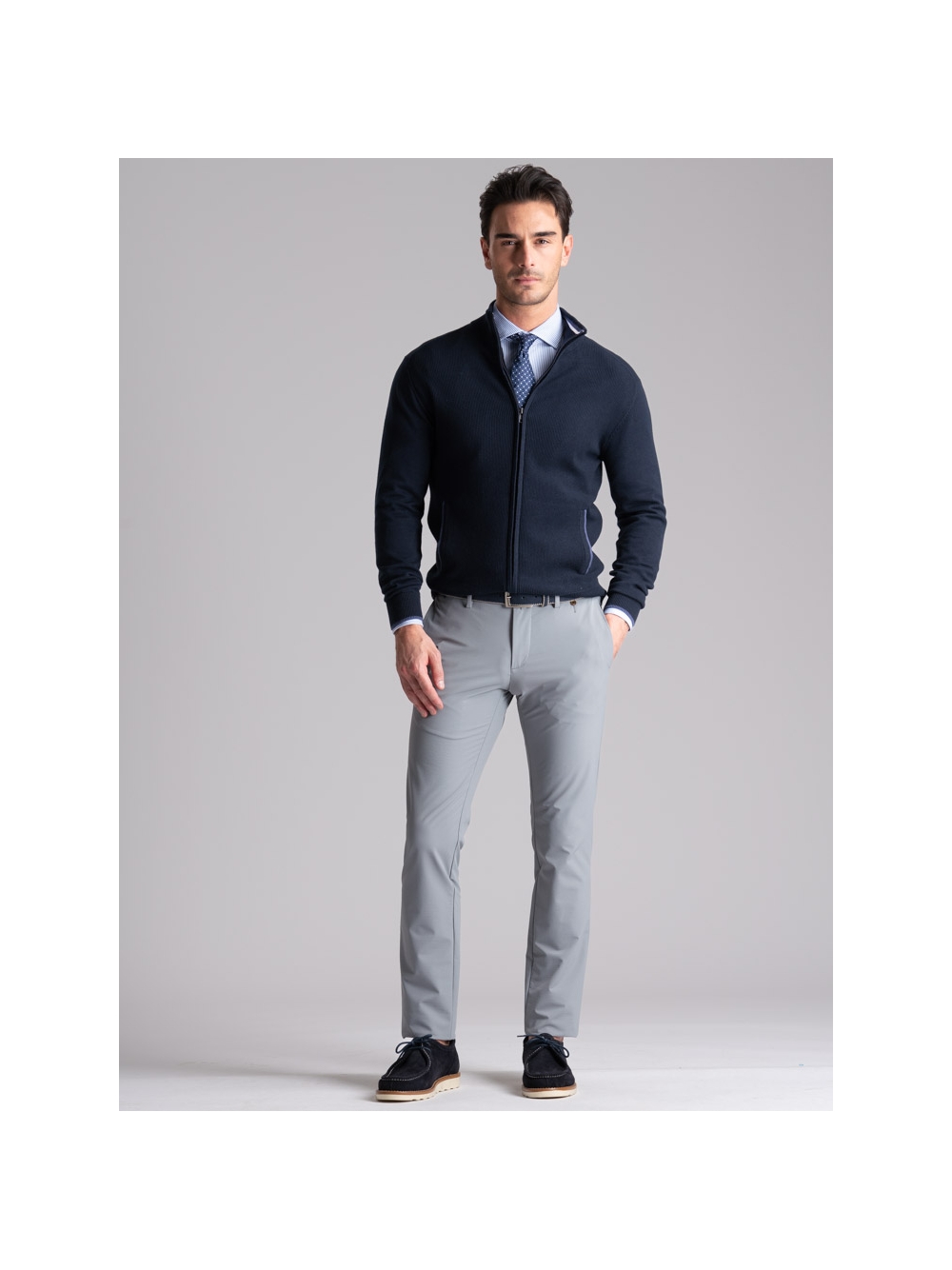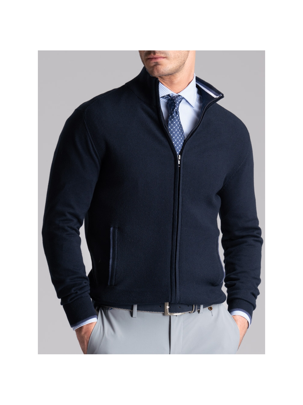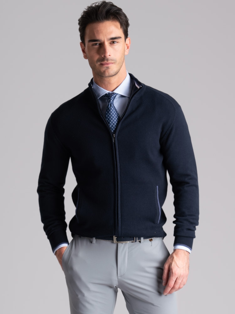 Maglia uomo full zip con tasche realizzata in cotone finezza 12 in tinta unita nelle varianti blu e tortora, con linee a contrasto sulla taschina e gli interni collo. Questa maglia è caratterizzata da una lavorazione a chicco di riso sul davanti e doppio cursore per l’allacciatura.