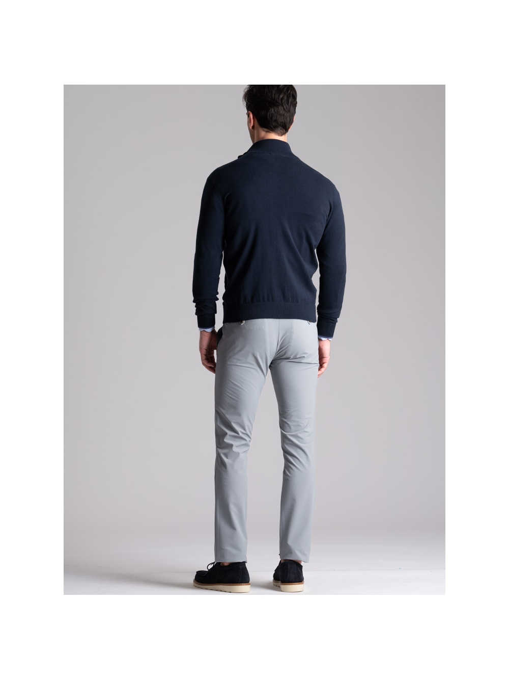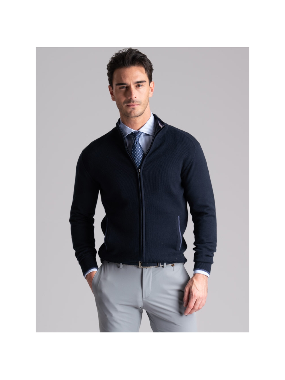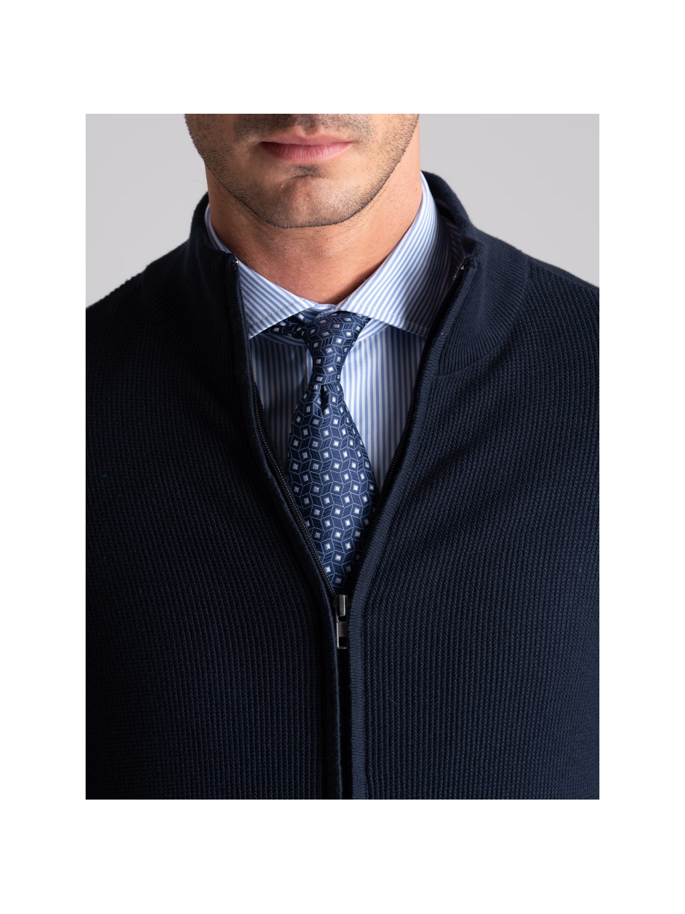 Maglia uomo full zip con tasche realizzata in cotone finezza 12 in tinta unita nelle varianti blu e tortora, con linee a contrasto sulla taschina e gli interni collo. Questa maglia è caratterizzata da una lavorazione a chicco di riso sul davanti e doppio cursore per l’allacciatura.