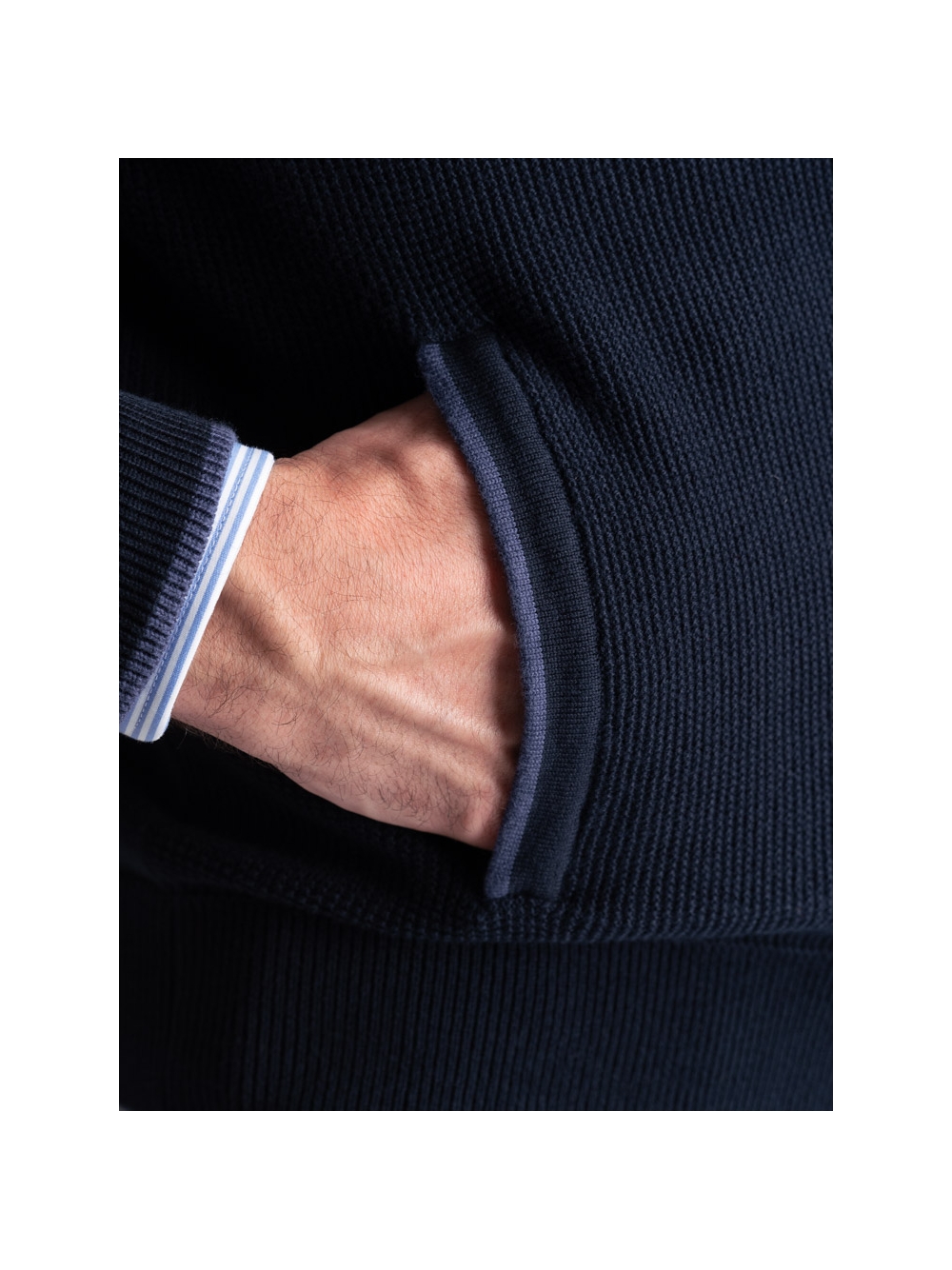 Maglia uomo modello full zip con tasche, in maglia di cotone tinta unita finezza 12, contrasti su collo e taschino e lavorazione a chicco di riso.