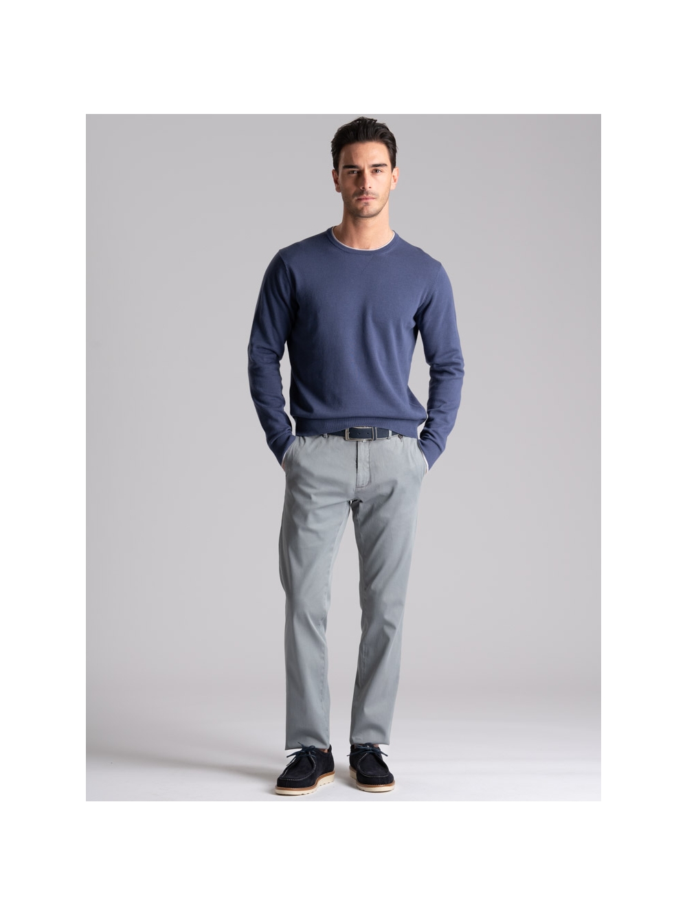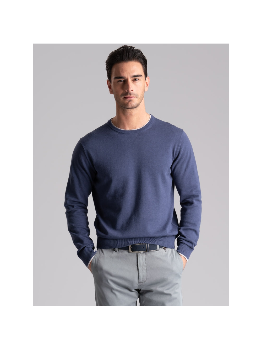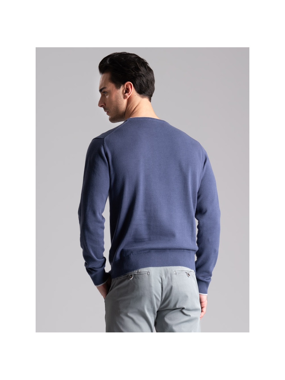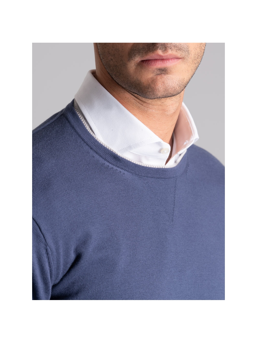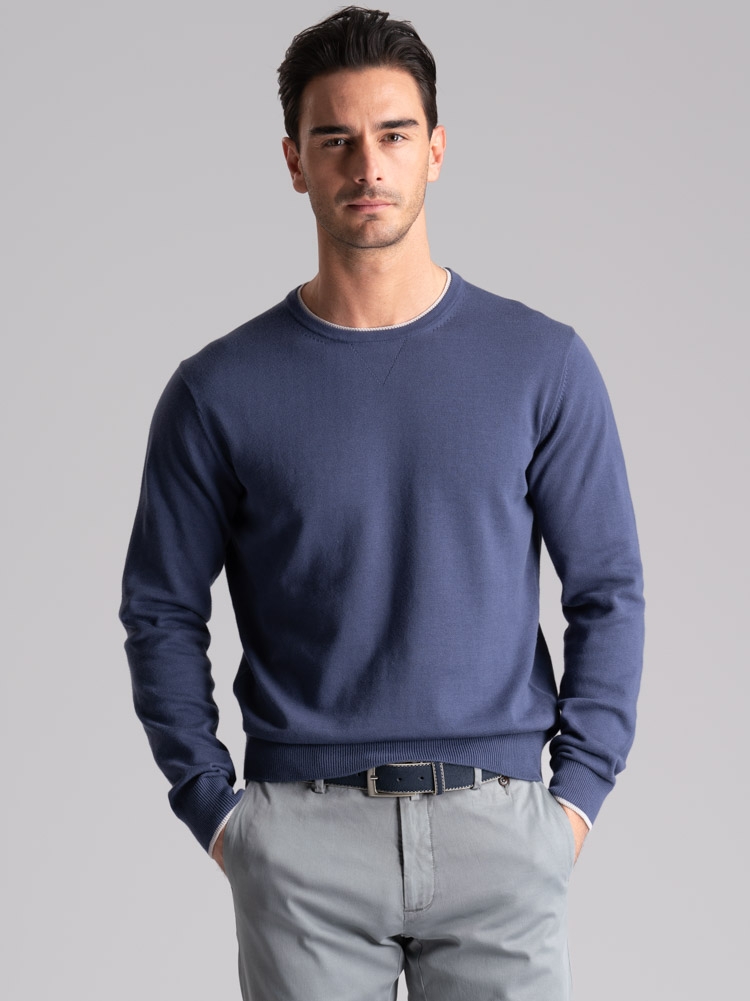 Maglia uomo modello girocollo realizzata in cotone tinta unita nelle varianti blu jeans e oliva. Questa maglia presenta una costruzione del collo molto articolata. È presente una bellissima calatura che crea un triangolino come quello della felperia che offre al capo un aspetto molto giovanile. Il collo doppio è realizzato con lavorazione tubolare e ha anche un rib di colore a contrasto ad arricchirlo.
