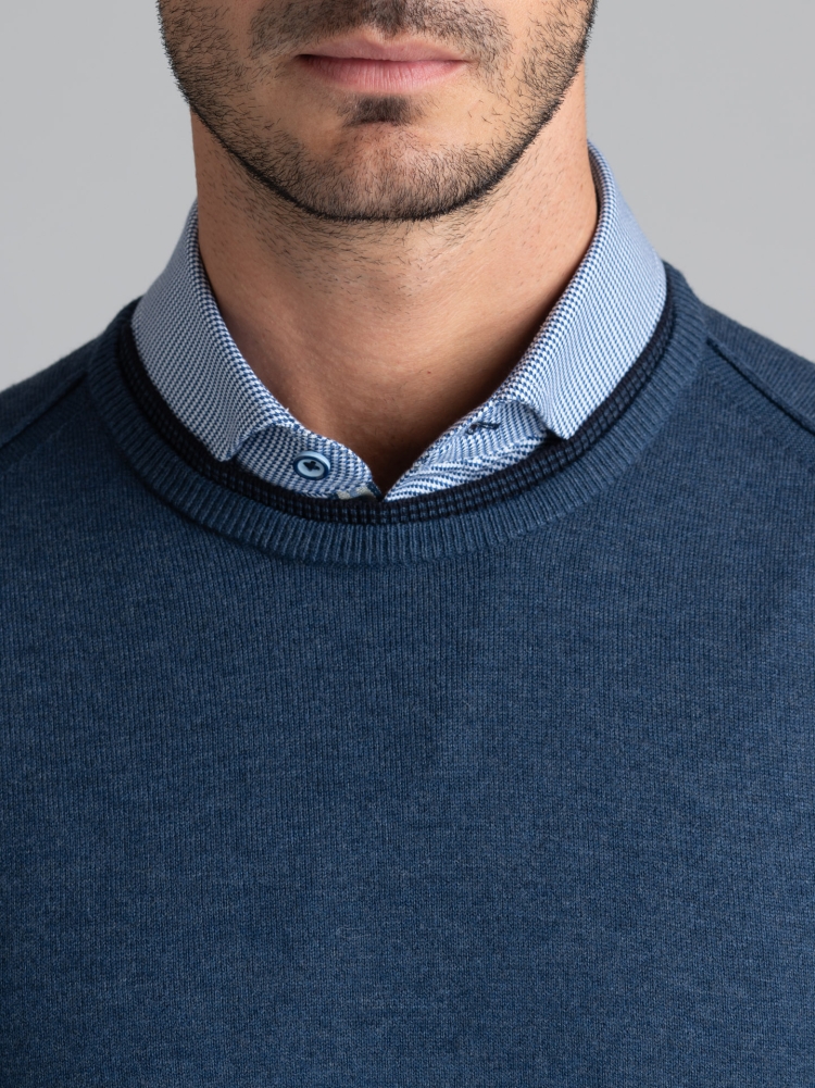 Maglia uomo finezza 12 modello girocollo caratterizzata da un effetto doppio su collo e polsi realizzato in tessuto a righe, e presenza di bottoni sui polsi. Questa maglia presenta il carrè e il giro manica con lavorazione al rovescio per dare tridimensionalità al capo. Disponibile nelle varianti colore jeans e verde.