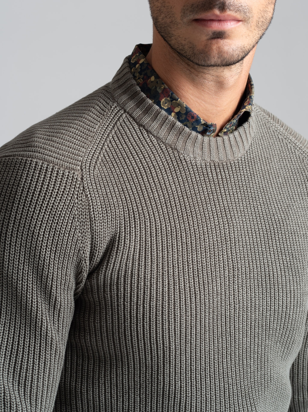 Maglia uomo girocollo realizzata in maglia 100% cotone a costa inglese finezza 7 con effetto delavé, caratterizzata dal girocollo con rib a costina. Disponibile nelle varianti colore blu e verde scuro.