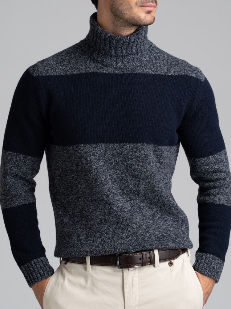 Maglia uomo modello dolcevita con collo alto a costina realizzato in maglia con lavorazione mouliné e inserti in tono melange.