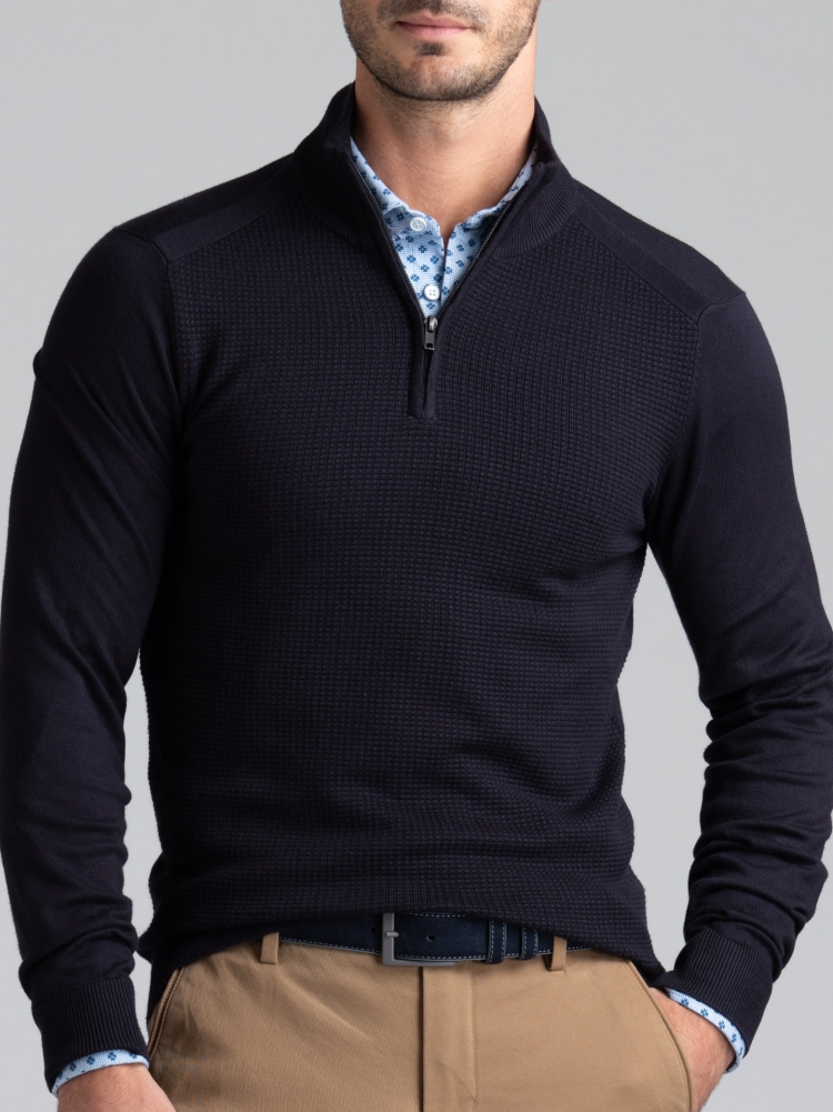 Maglia uomo modello mezza zip realizzata in viscosa e caratterizzata da una lavorazione in maglia micro jacquard operata sul davanti e un intarsio sul carré e la spalla. Questa maglia mezza zip è disponibile nelle varianti colore blu e coccio.