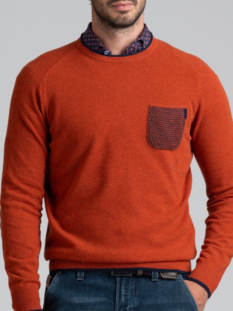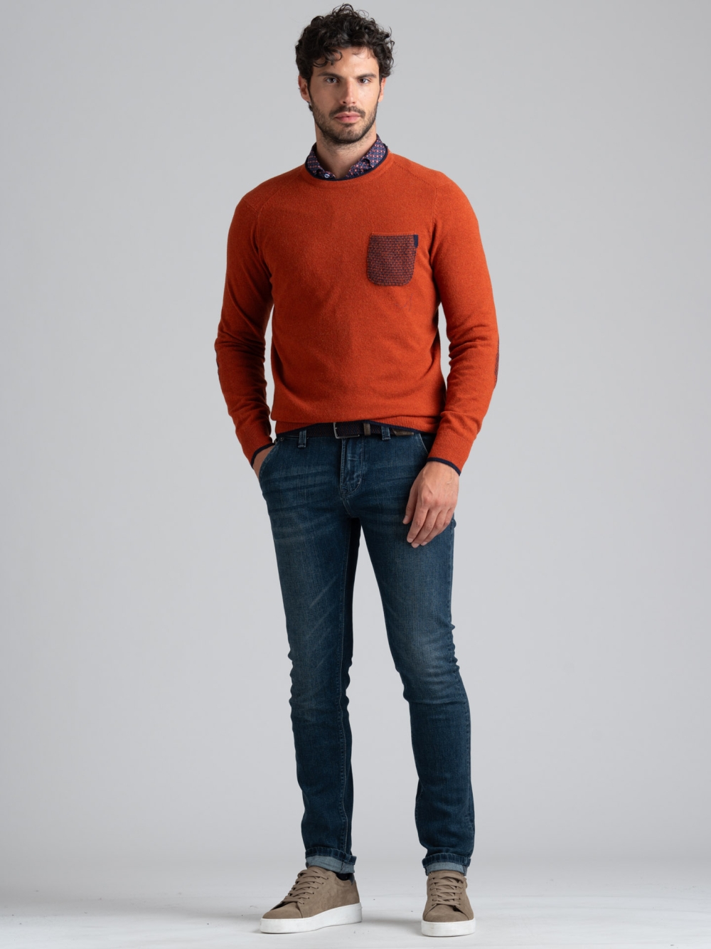 Maglia uomo girocollo con rollino a contrasto, tasca, toppe e inserti jacquard, realizzata in misto lana finezza 12.