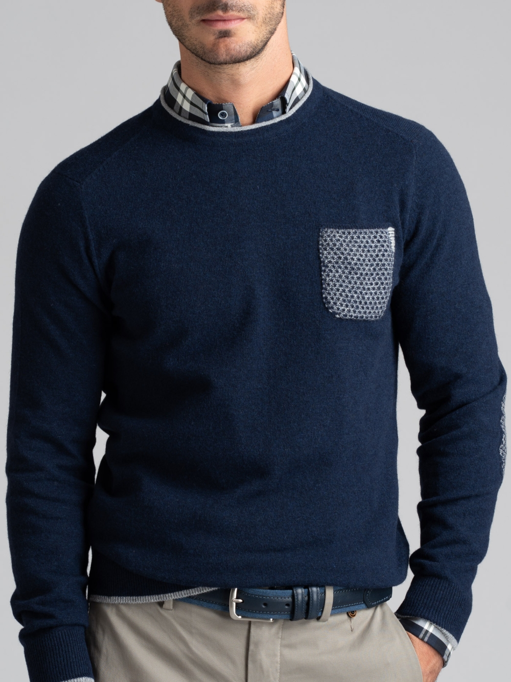Maglia uomo girocollo con rollino a contrasto, tasca, toppe e inserti jacquard, realizzata in misto lana finezza 12.