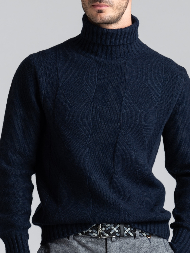 Maglia uomo modello dolcevita con maxi treccia realizzata in maglia misto lana finezza 5, e lavorazione a coste sul collo, polsi e balza.