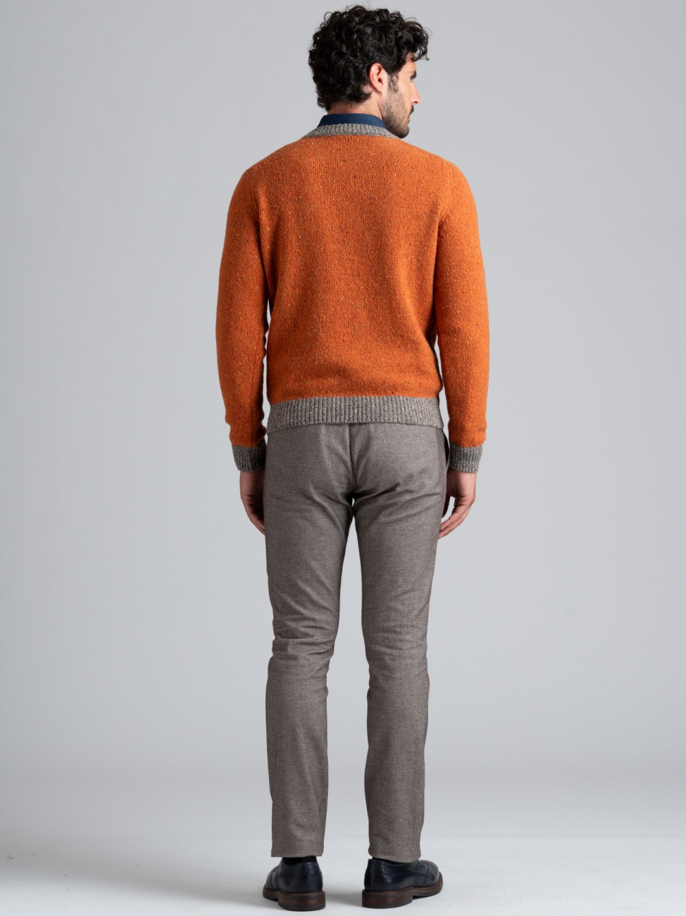 Maglia girocollo in misto lana con filato bottonato finezza 7, con collo, balza sul fondo e polsi a contrasto, disponibile nelle varianti colore arancio e azzurro.