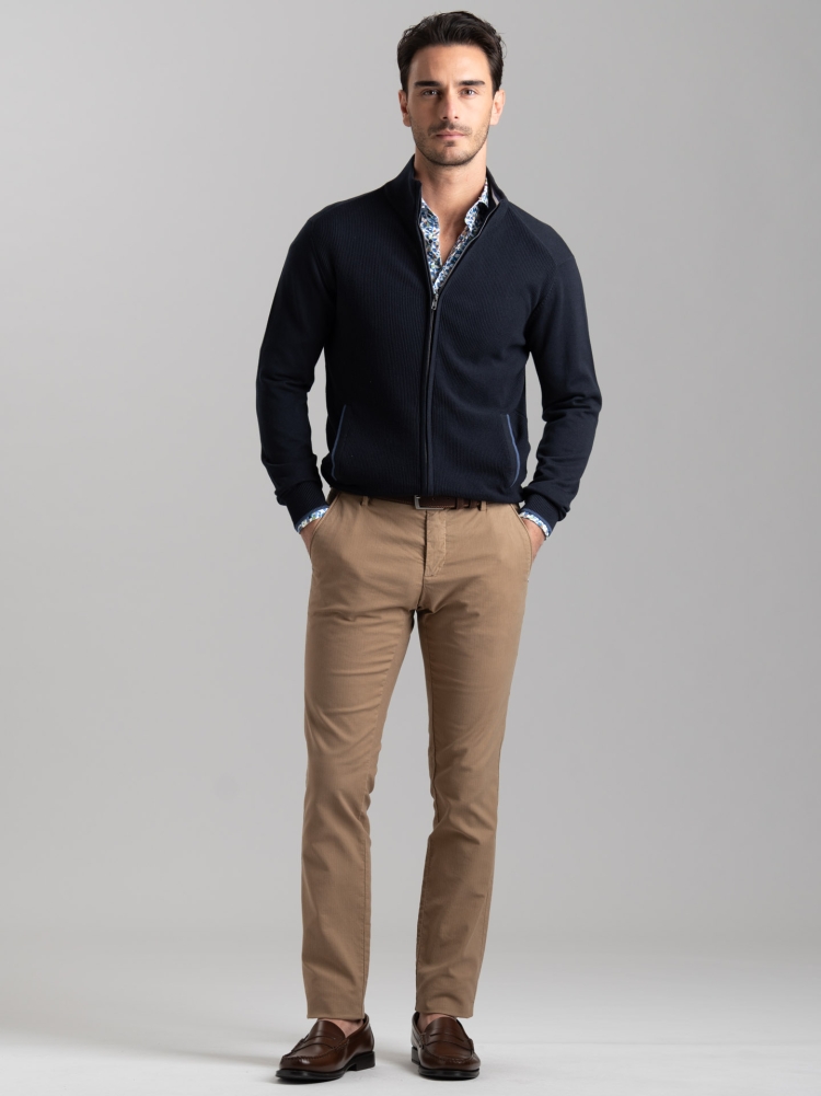 Maglia uomo full zip con tasche realizzata in cotone finezza 12 in tinta unita nelle varianti blu e tortora, con linee a contrasto sulla taschina e gli interni collo. Questa maglia è caratterizzata da una lavorazione a chicco di riso sul davanti e doppio cursore per l’allacciatura.