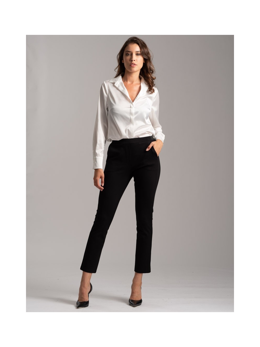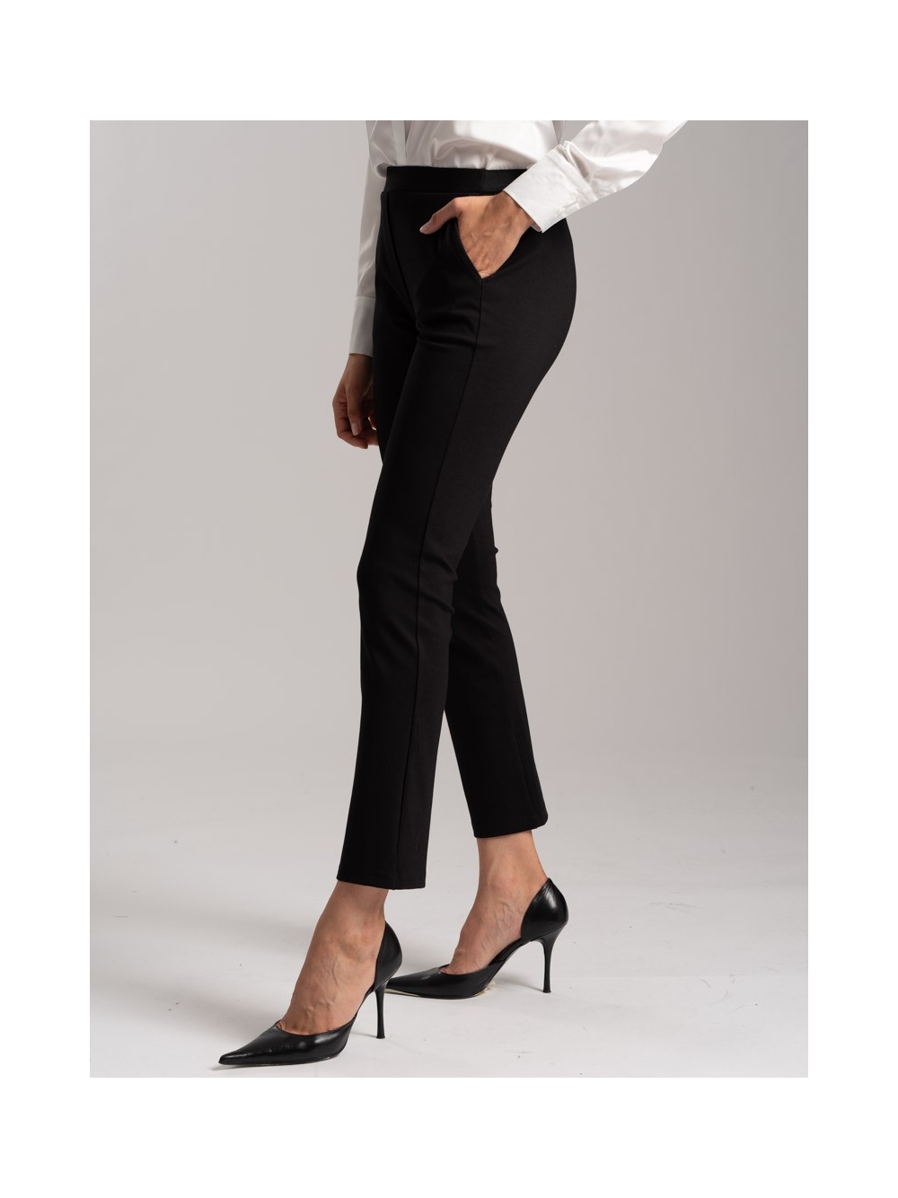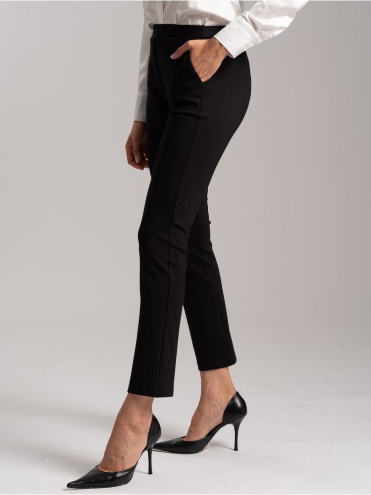 Pantalone donna realizzato in Punto Milano, vestibilità sigaretta con elastico in vita dietro.