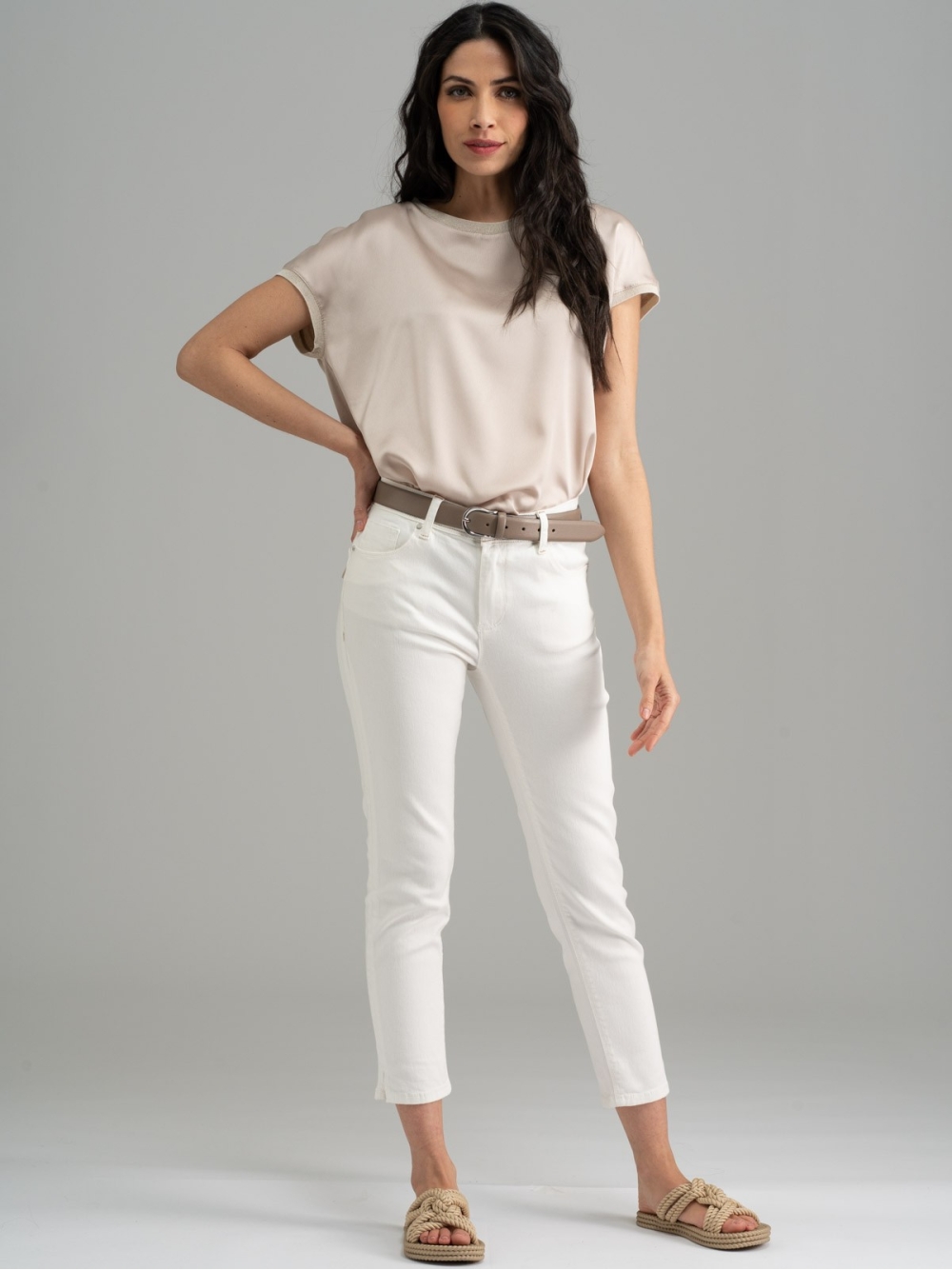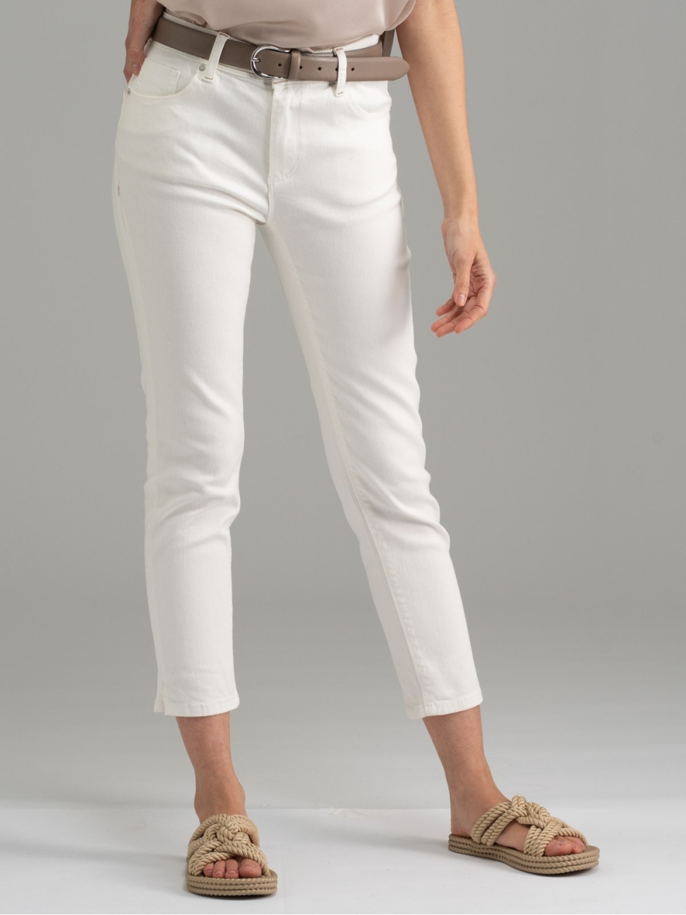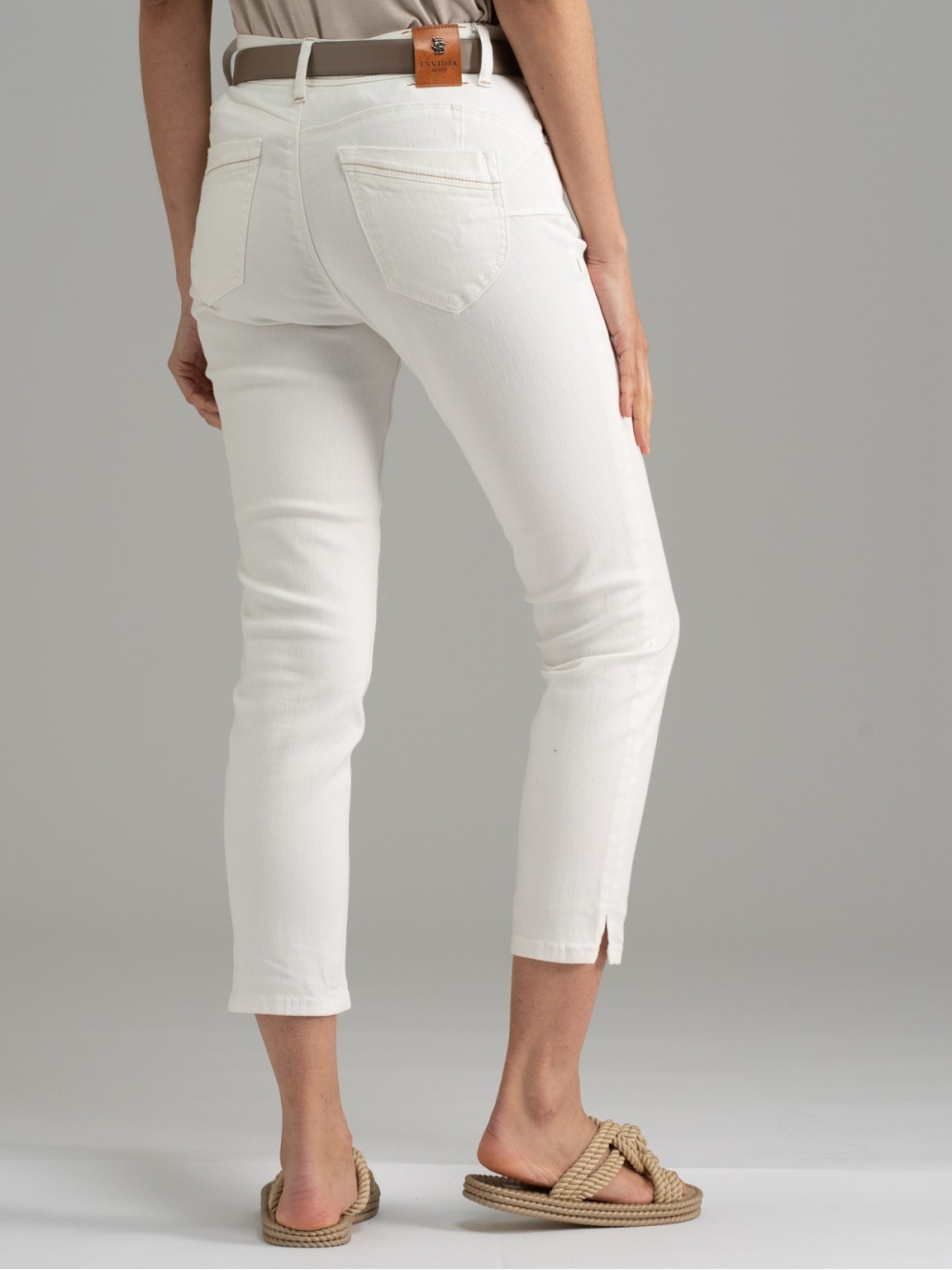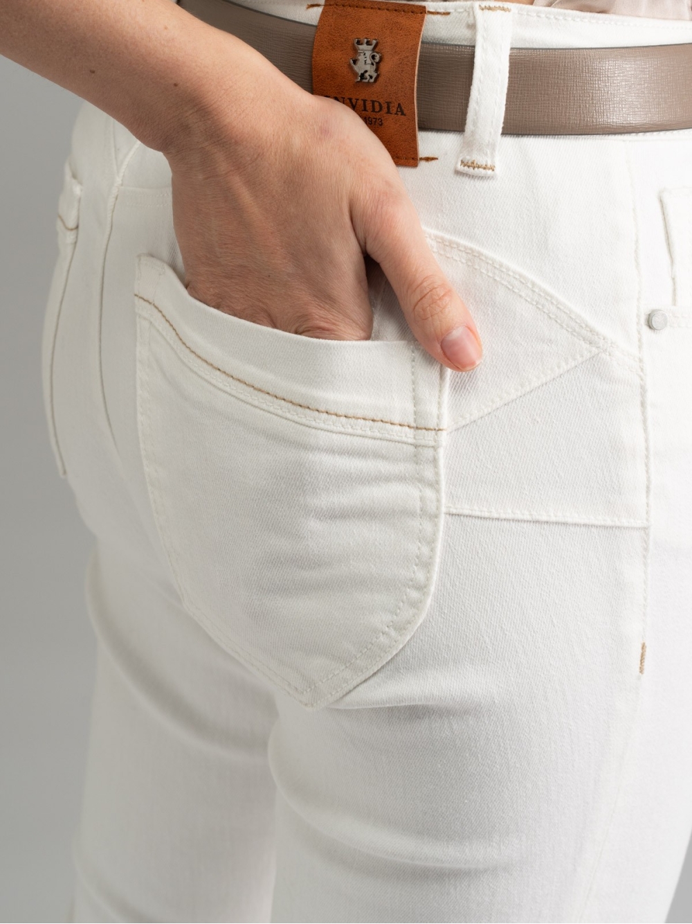 Jeans donna 5 tasche in denim stretch colore bianco caratterizzato da eleganti impunture sabbia sulle tasche e lungo in profili della cintura.