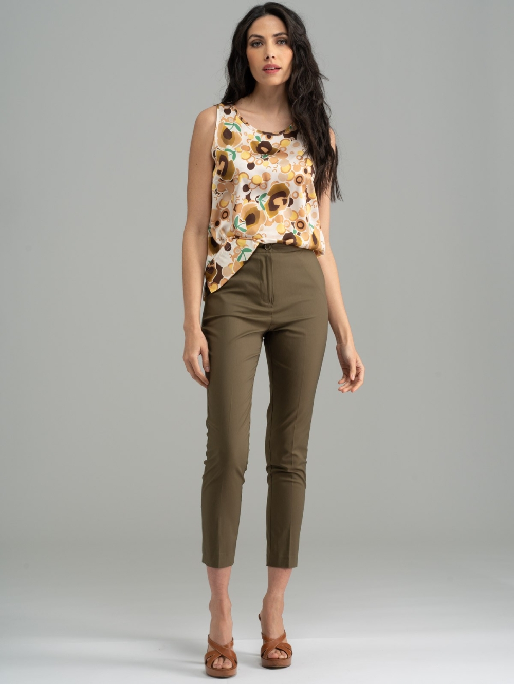 Pantalone donna realizzato in tessuto tecnico di cotone leggero stretch verde militare, modello a sigaretta, con abbottonatura davanti, con ottima vestibilità. Questi pantaloni donna sono abbinabili alla giacca verde militare della stessa collezione primavera estate 2023.