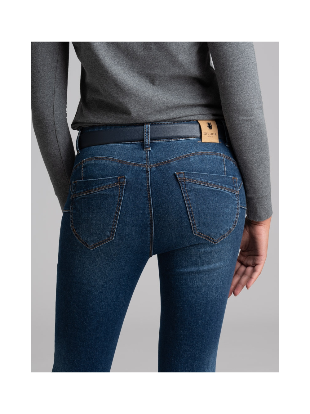Jeans donna modello 5 tasche realizzato in denim lavaggio medio super stretch dalla vestibilità aderente ma molto confortevole. Il tessuto di alta qualità è compatto seppur elastico, così da durare nel tempo, lavaggio dopo lavaggio e utilizzo dopo utilizzo. Con cuciture a contrasto, il jeans donna cinque tasche ha la salpa sul retro con logo INVIDIA 1973.