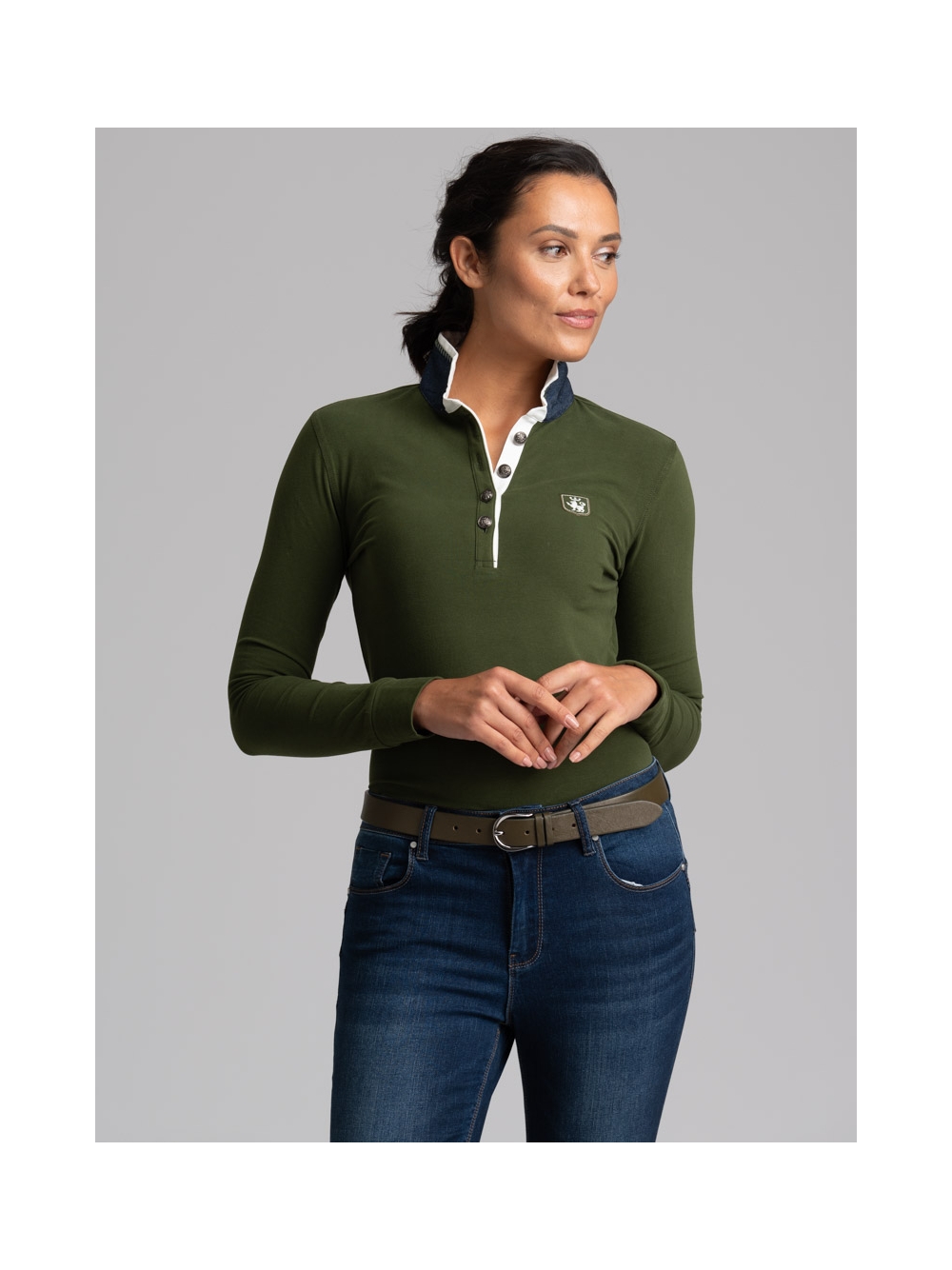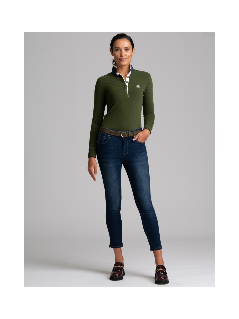 Jeans donna in denim stretch molto confortevole, modello 5 tasche a sigaretta, lavaggio scuro con cuciture a contrasto e salpa con logo.