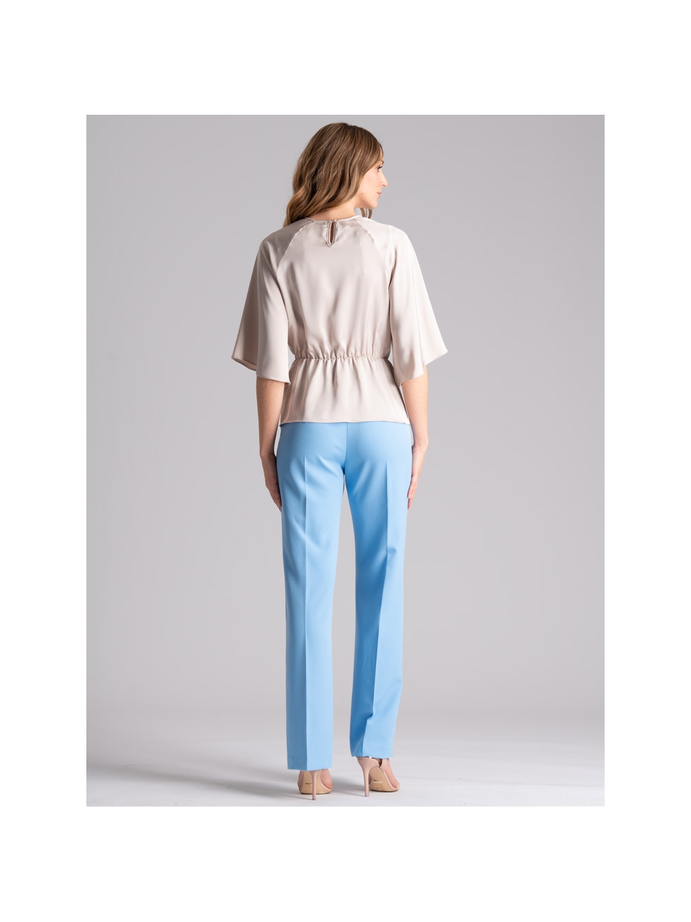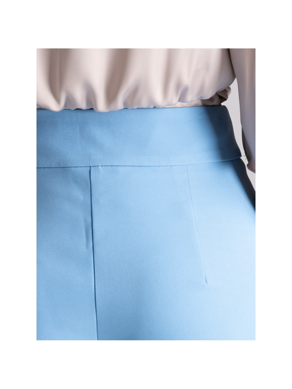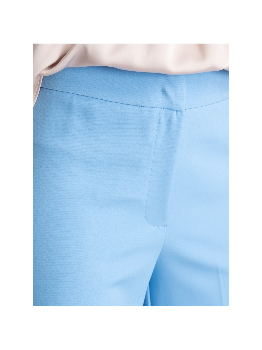 Pantalone donna con gamba dritta fluida, cintura alta e chiusura con ganci nascosti, realizzato in confortevole tessuto bistretch, nelle varianti colore sabbia e azzurro. Insieme alla giacca donna sfoderata e sciancrata dello stesso tessuto e colore, crea un completo raffinato perfetto per occasioni eleganti o da indossare ad una cerimonia.